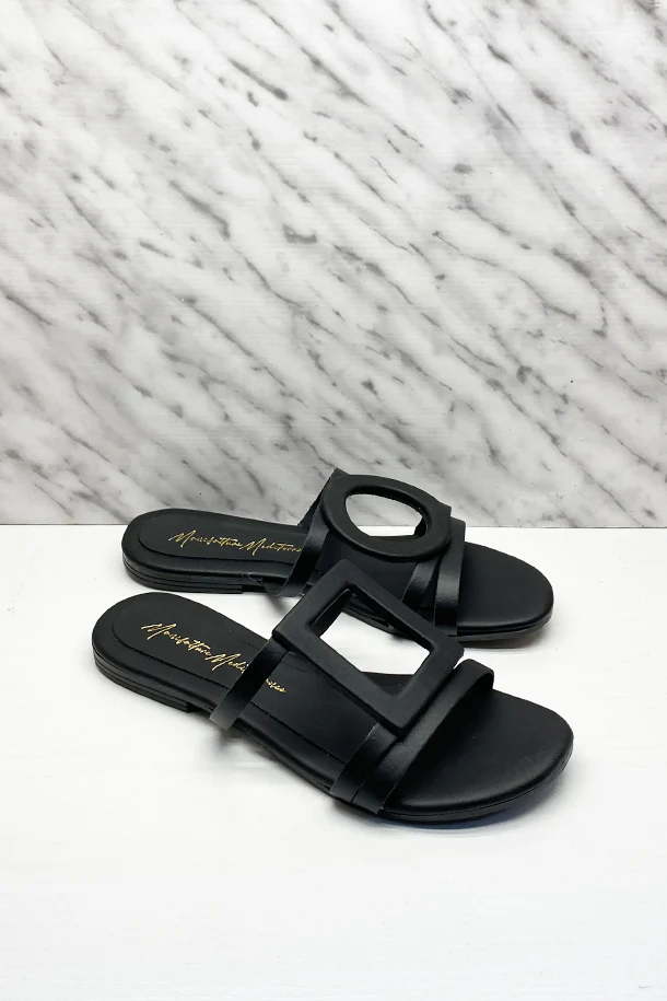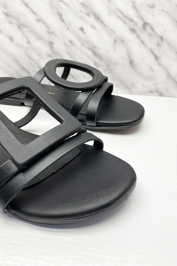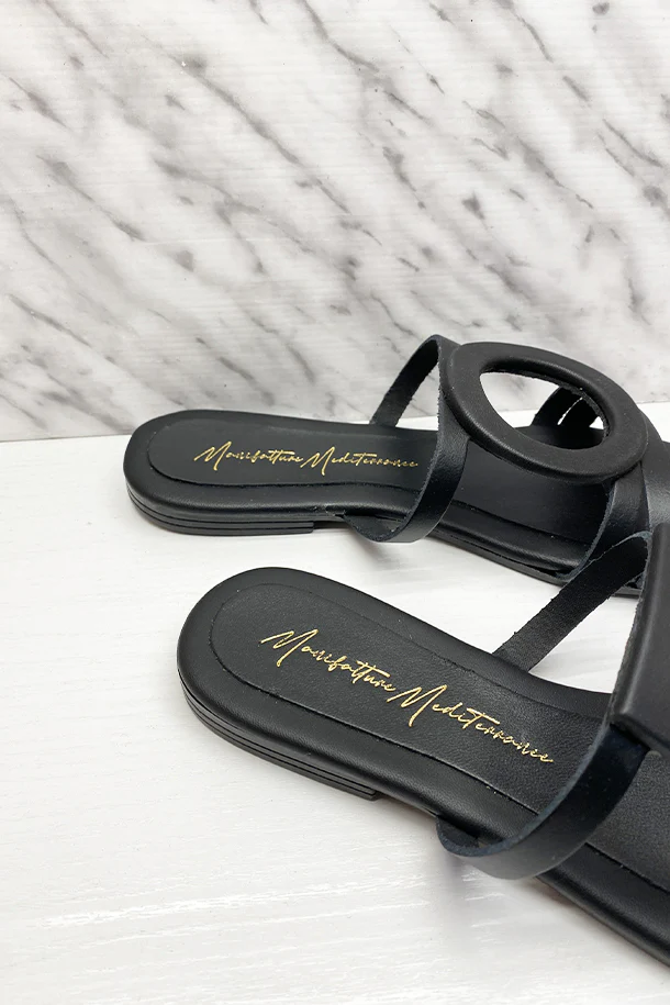 Sandali bassi mono fascia in pelle laminata solid color, decorazione asimmetrica, suola logata in pelle, fondo flat in gomma