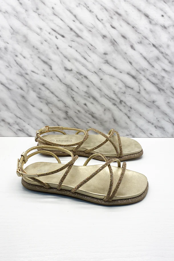 Sandali bassi in eco pelle laminata con fasce tubolari metalliche multicolore, fibbia de regolazione alla caviglia, suola logata, fondo in gomma bordato con glitter