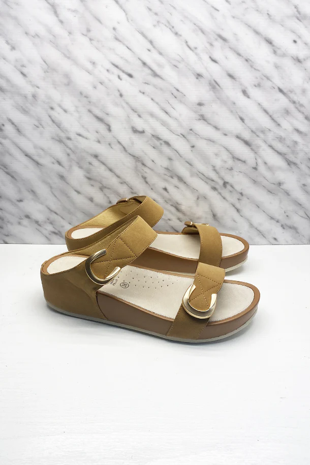 Sandali bassi in pelle solid color con doppia fascia a strappo, clip metalliche decorative, suola sagomata in pelle, rialzo in tinta con fondo in gomma