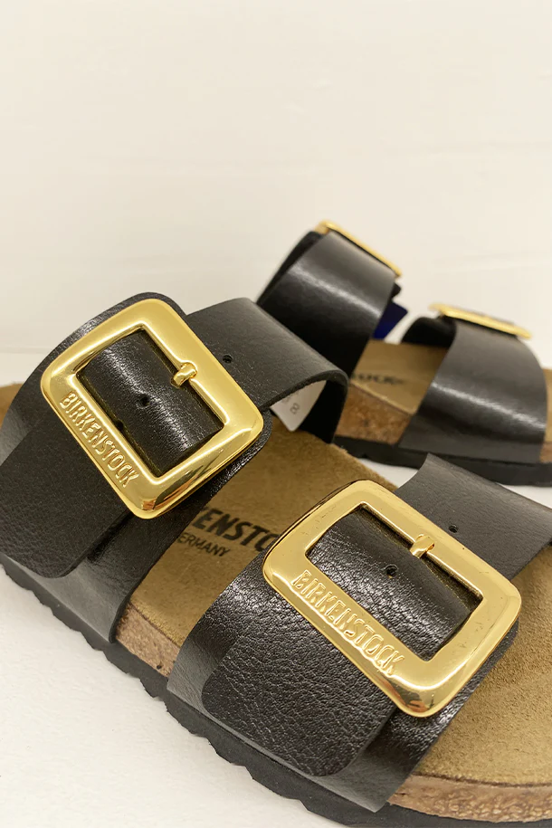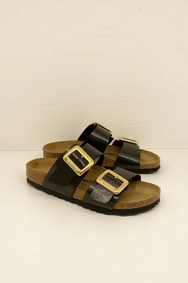 Sandali bassi in pelle laminata con doppia fibbia metallica di regolazione, suola in camoscio sagomata, fondo flat in gomma