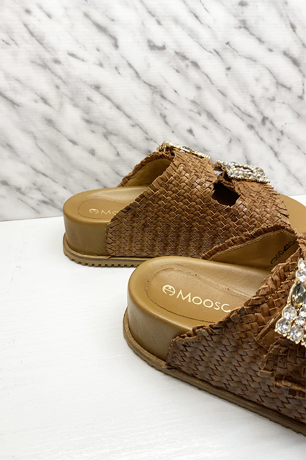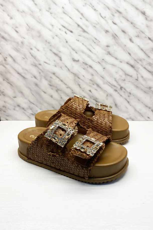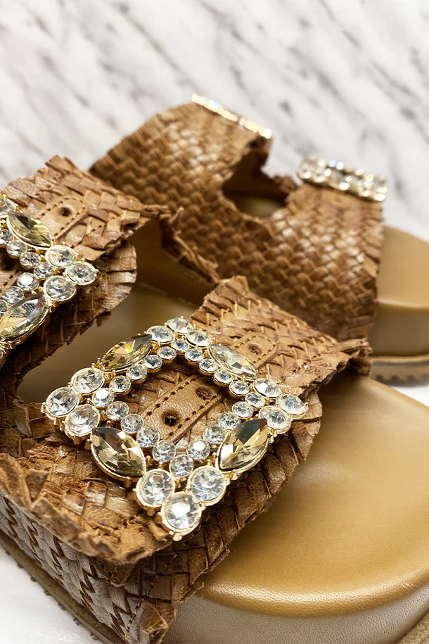 Sandali bassi doppia fascia in pelle sfrangiata con doppia fibbia di regolazione, brillanti decorativi, suola logata in pelle, platform 40mm in tinta con fondo in gomma