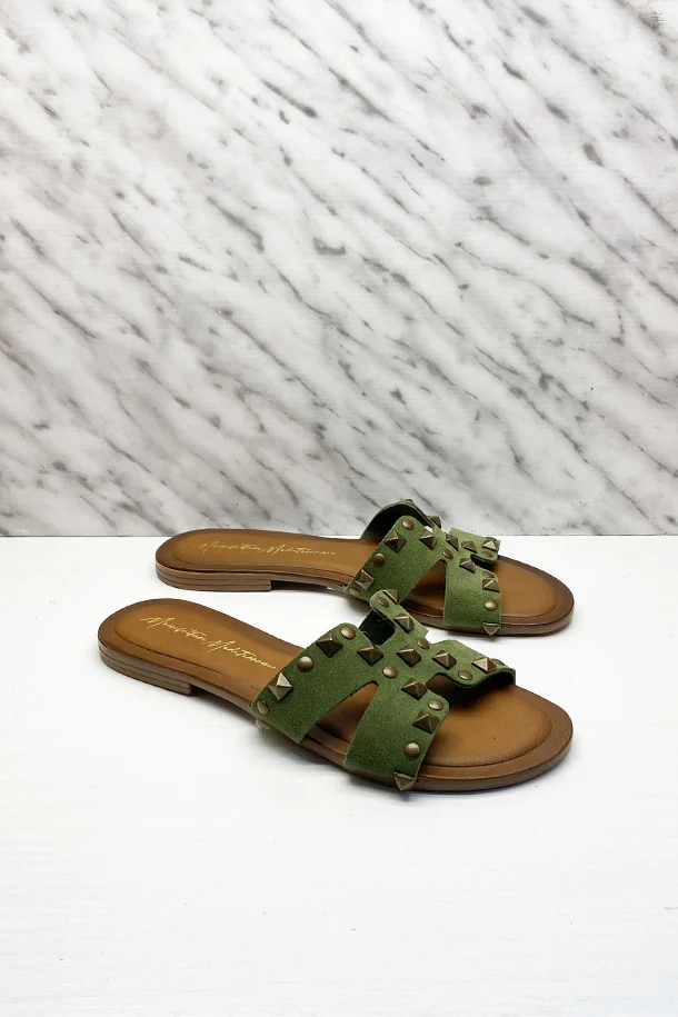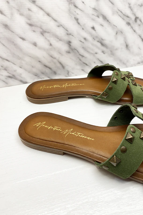 Sandali bassi mono fascia in pelle solid color, borchie metalliche, sagomatura geometrica, suola logata in pelle, fondo flat in gomma