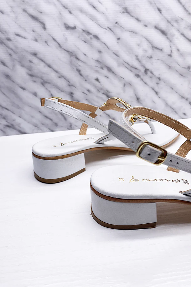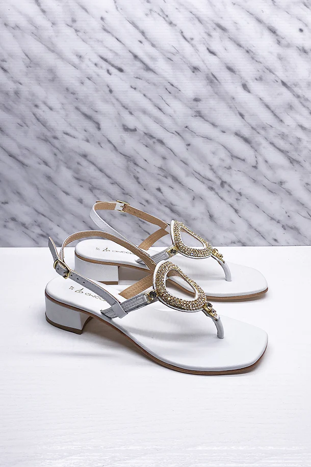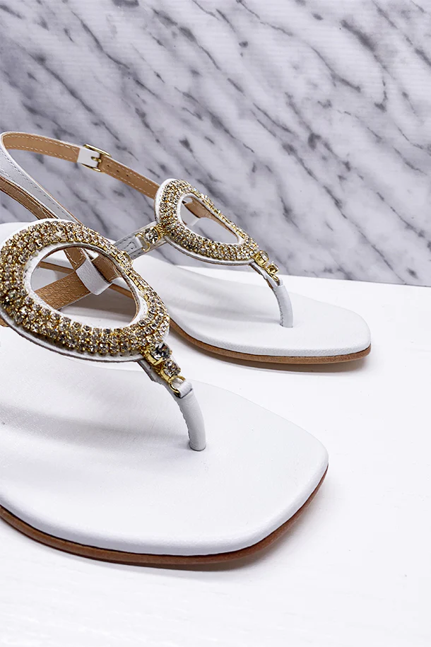 Sandali bassi in eco pelle con fibbia di regolazione alla caviglia, fascia con disegno geometrico decorata con brillanti, suola in gomma