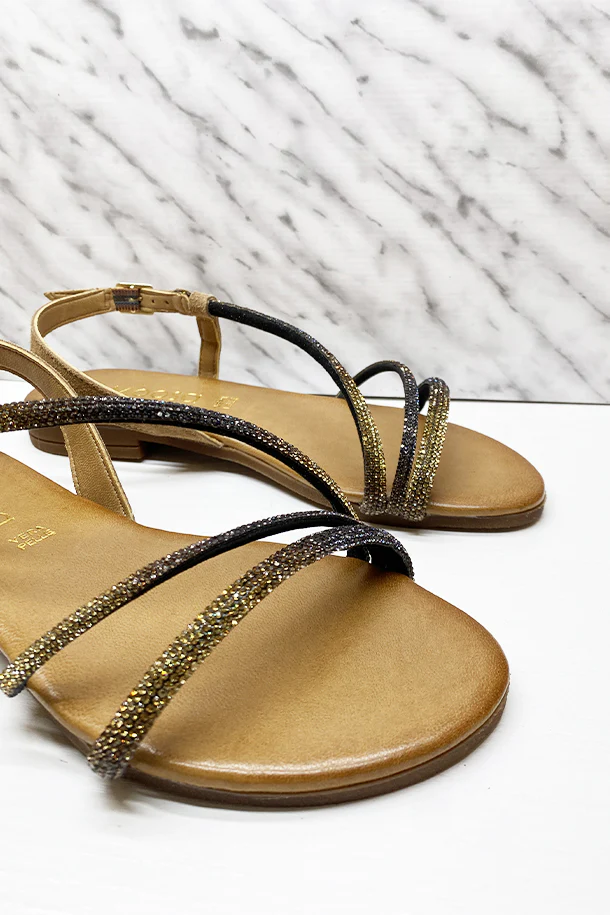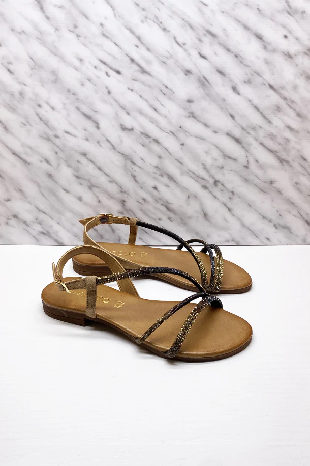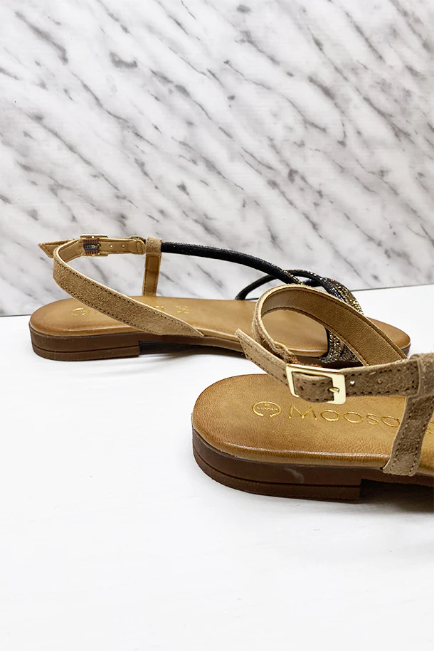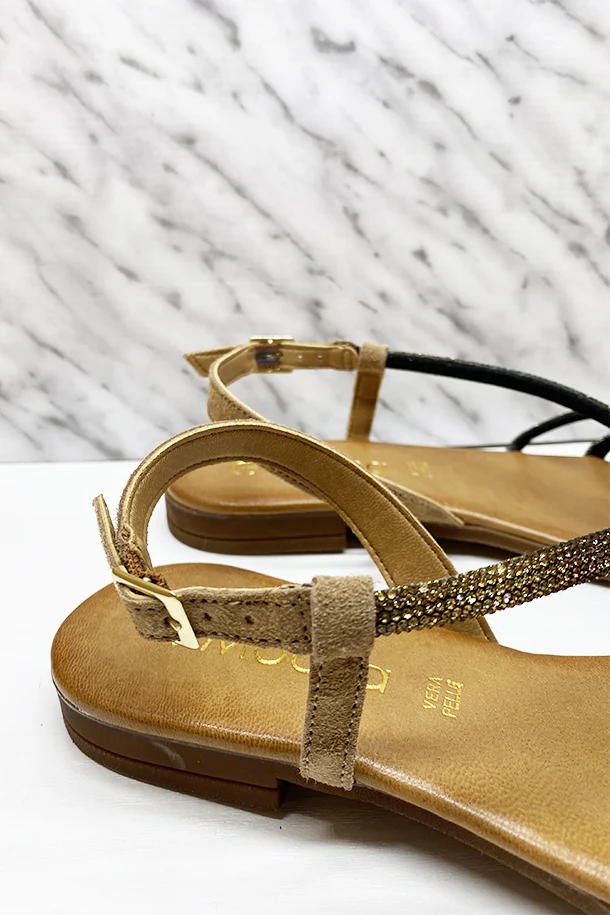 Sandali bassi in eco camoscio con strass brillanti decorativi, fibbia di regolazione, suola in pelle con fondo in gomma