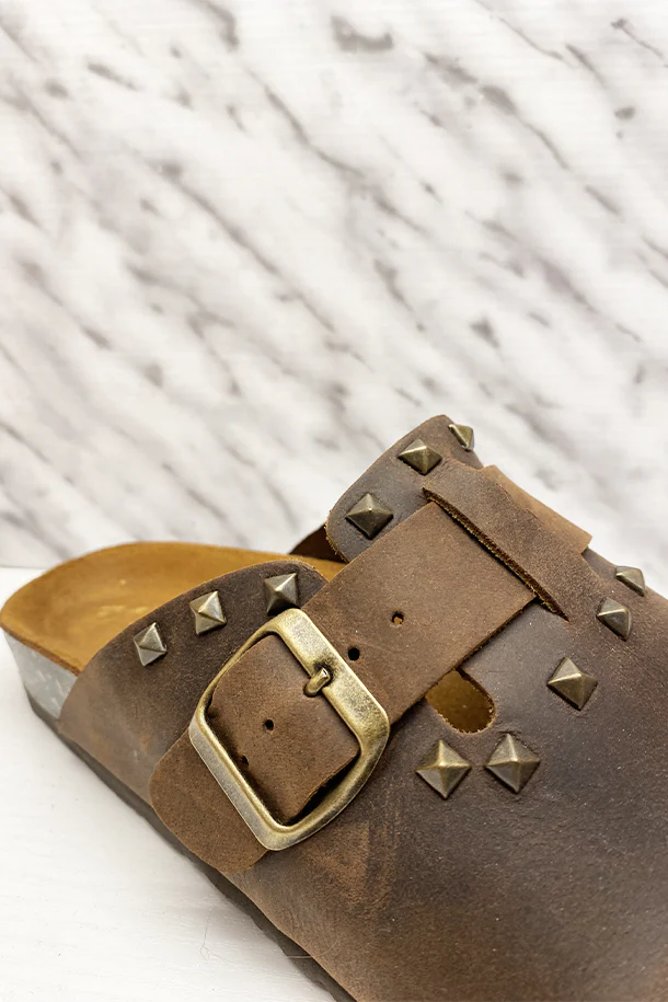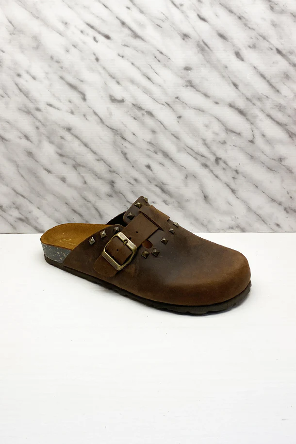 Sandali bassi sabot in pelle naturale con fibbia decorativa e borchie metalliche, suola sagomata in suede, fondo flat in gomma