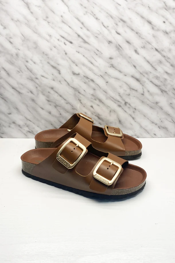 Sandali bassi in pelle solid color con doppia fascia e fibbie metalliche di regolazione, suola sagomata, fondo in sughero e gomma