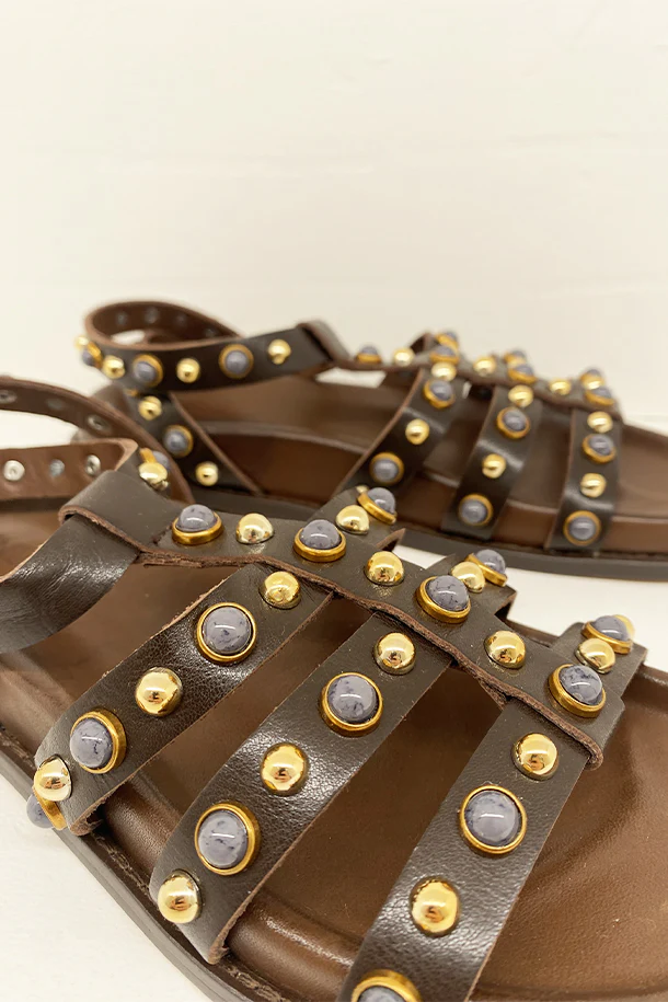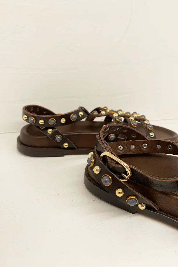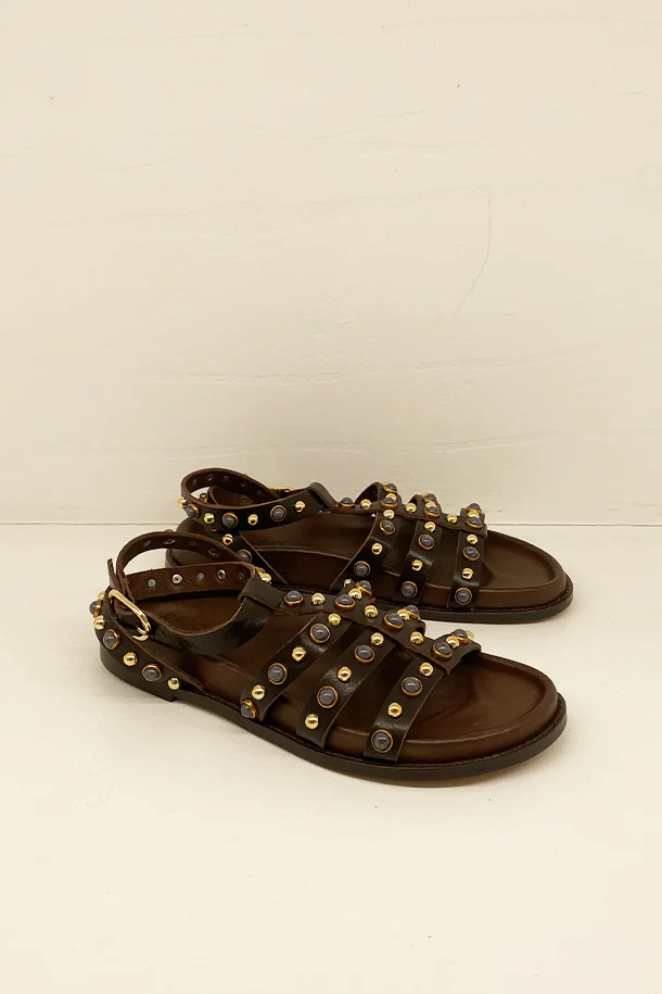 Sandali bassi a in pelle solid color fasce intrecciate con borchie metalliche, fibbia di regolazione alla caviglia, suola sagomata in pelle con fondo in gomma