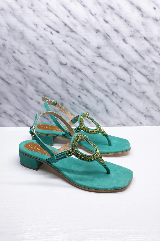 Sandali bassi in eco pelle con fibbia di regolazione alla caviglia, fascia con disegno geometrico decorata con brillanti, suola in gomma