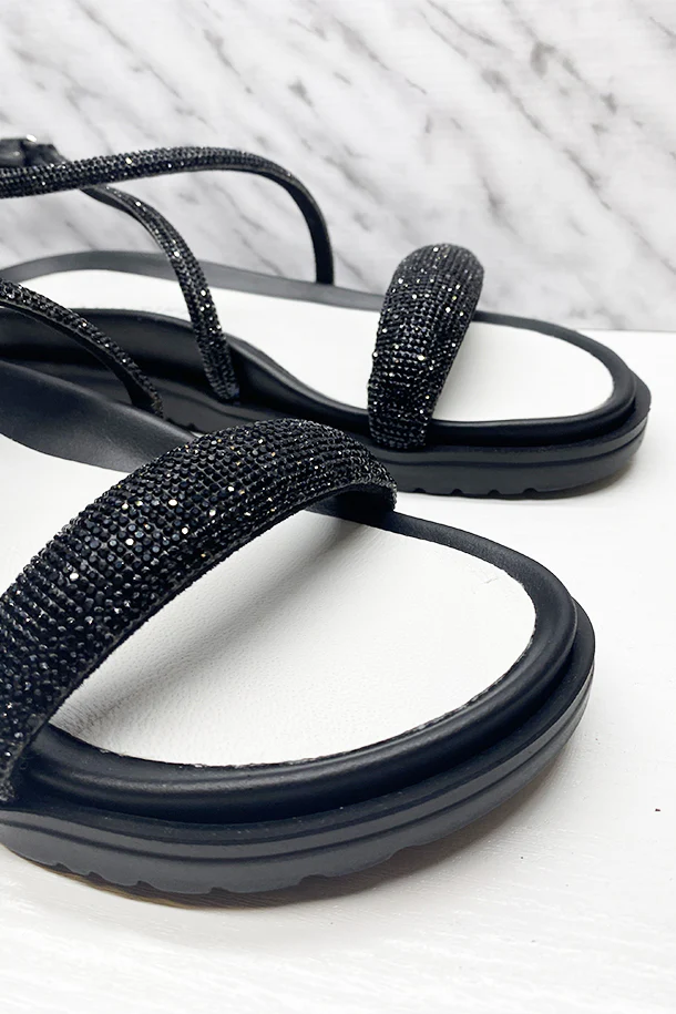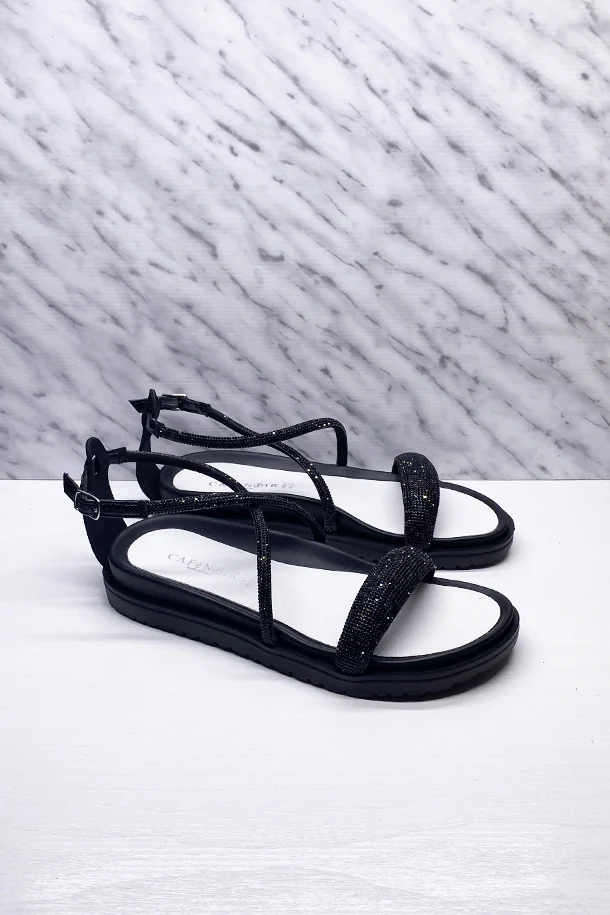 Sandali bassi in eco pelle a fasce incrociate rivestita da strass brillanti, fibbia di regolazione alla caviglia, suola in pelle bicolore con fondo in gomma