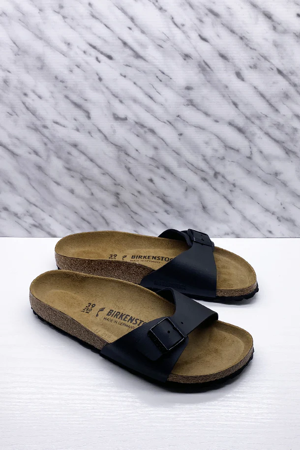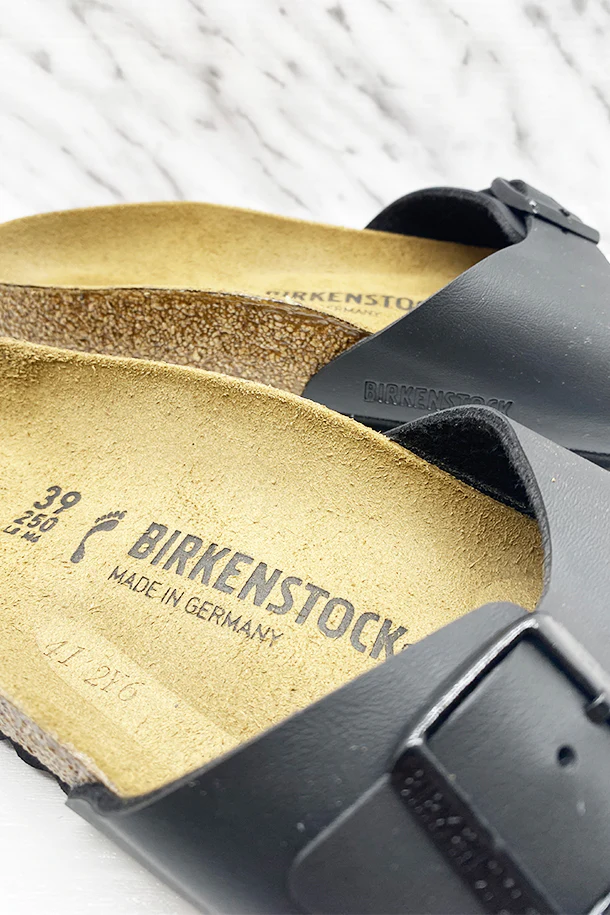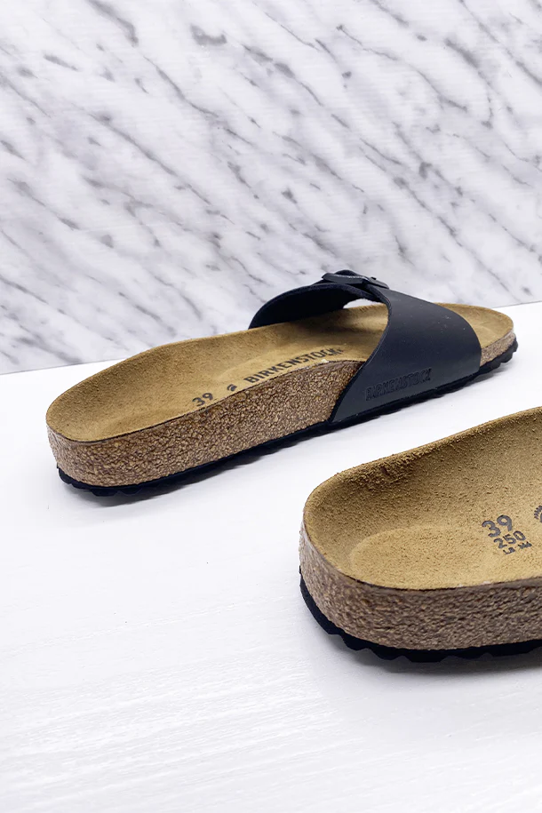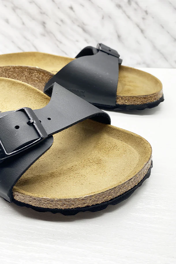 Sandali bassi in pelle mono fascia con fibbia metallica di regolazione, suola in scamosciato con plantare in sughero e lattice, fondo in gomma