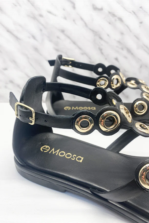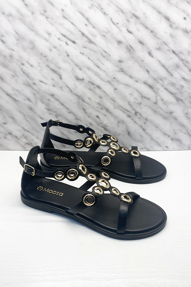 Sandali bassi in eco pelle solid color con traforatura circolare e occhielli metallici decorativi, fibbia di regolazione alla caviglia, suola interna inbottita con logo, fondo in gomma