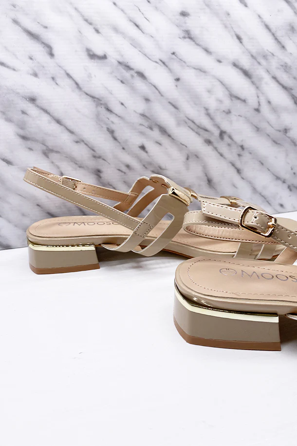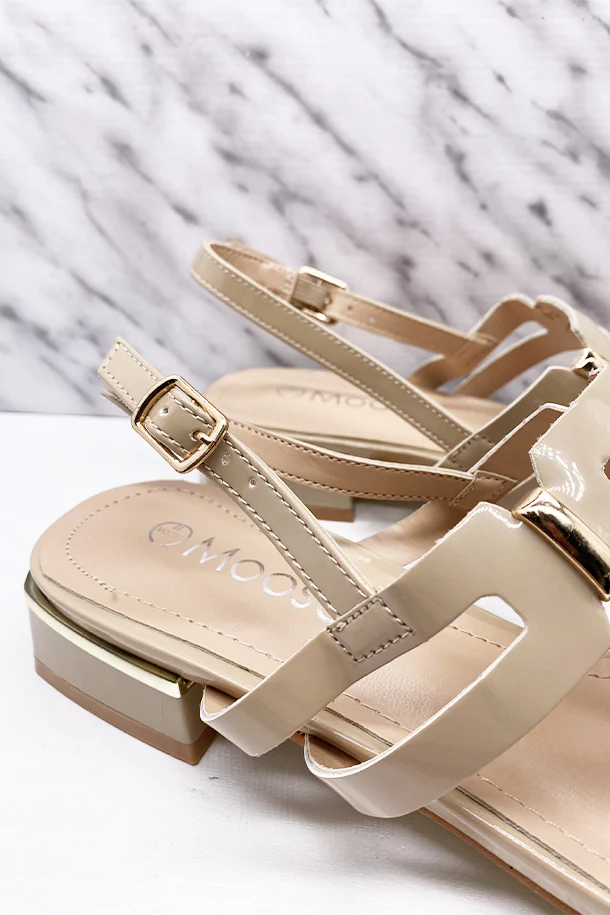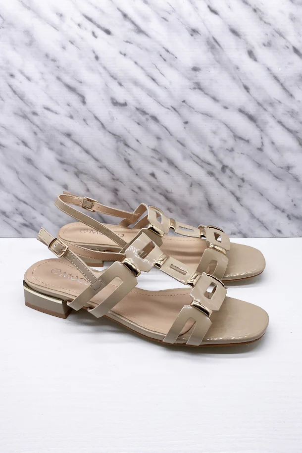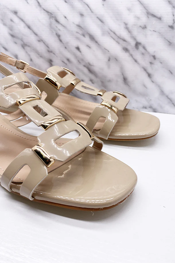 Sandali bassi in eco pelle verniciata solid color, inserti metallici a contrasto, fibbia posteriore di regolazione, tacco 20mm con inserto metallico, fondo e suola in gomma
