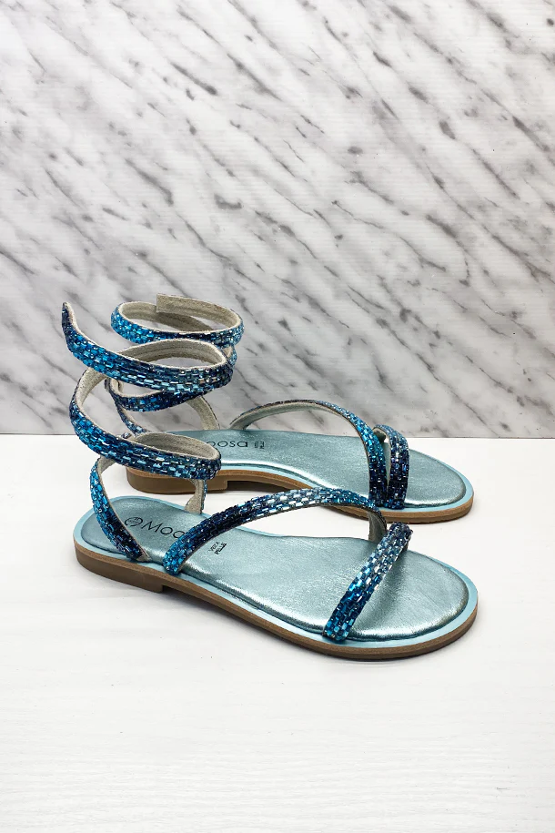Sandali bassi in tessuto rivestito da gemme brillanti, doppia fascia frontale, spirale semi rigida alla caviglia, suola logata in pelle laminata, fondo in gomma