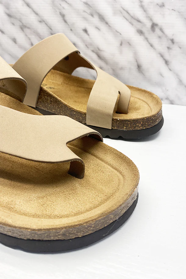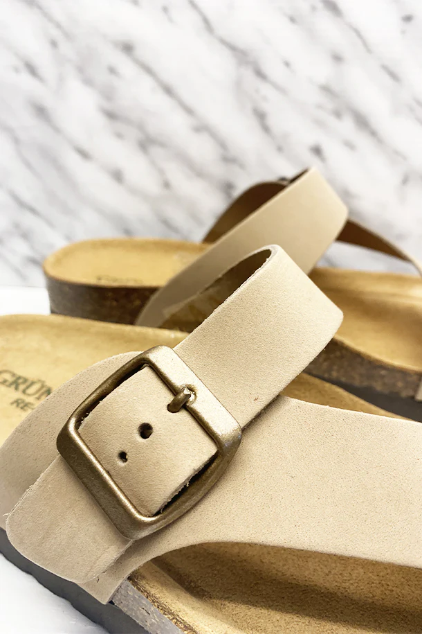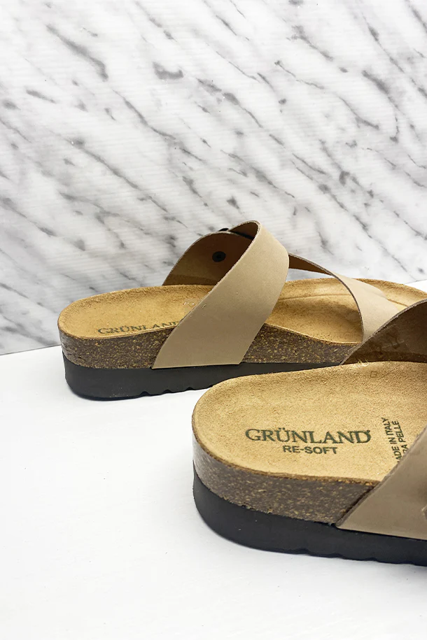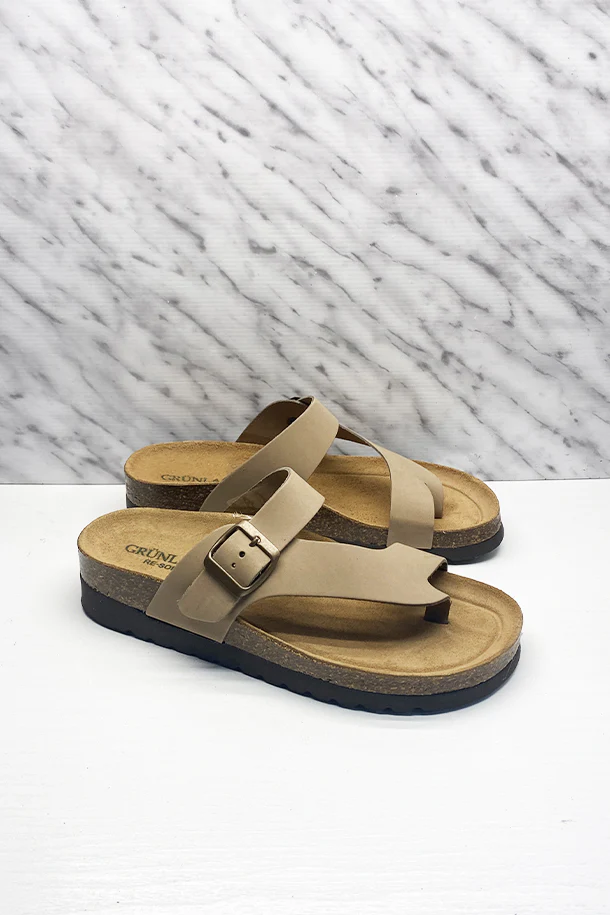 Sandali bassi infradito in pelle solid color con mono fascia e fibbia metallica di regolazione, suola sagomata, fondo in sughero e gomma