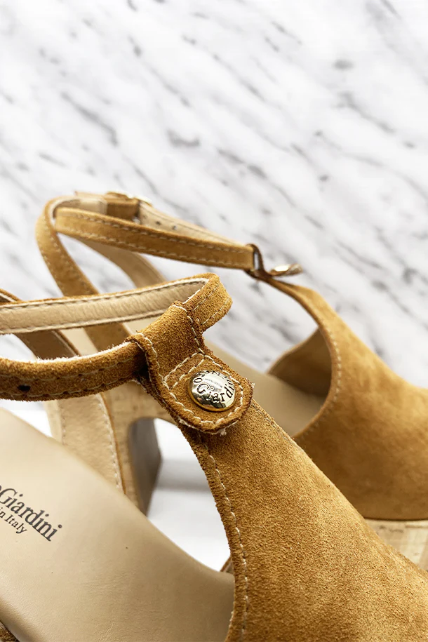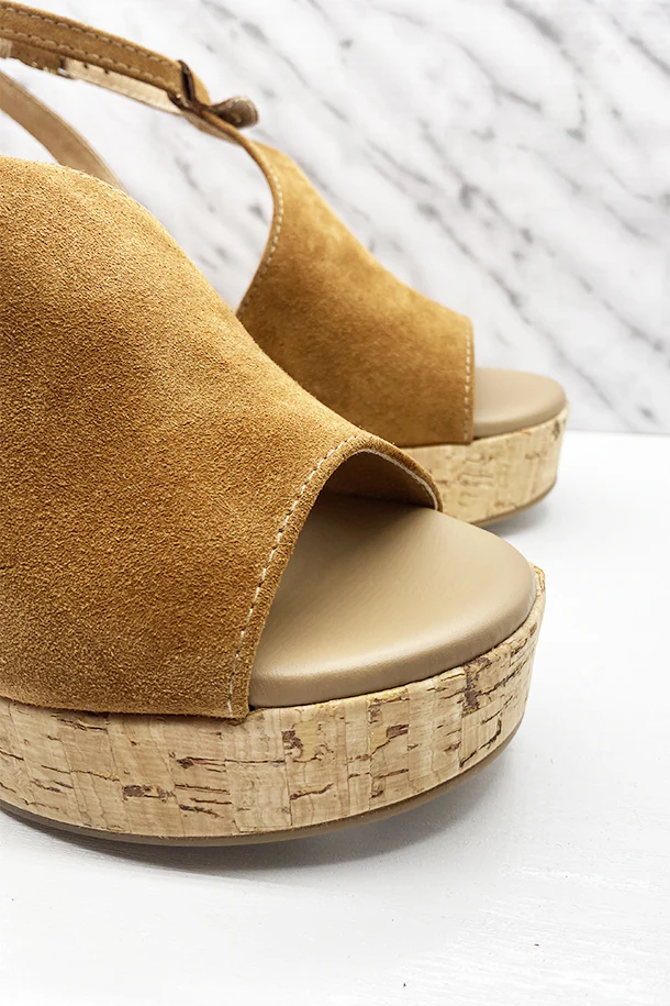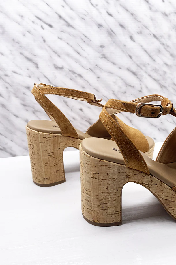 Sandali in camoscio con fibbia di regolazione alla caviglia, suola in pelle, tacco 80 mm in sughero con plateau 20 mm, fondo in gomma