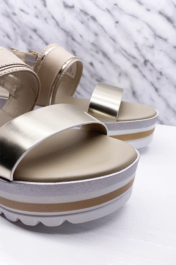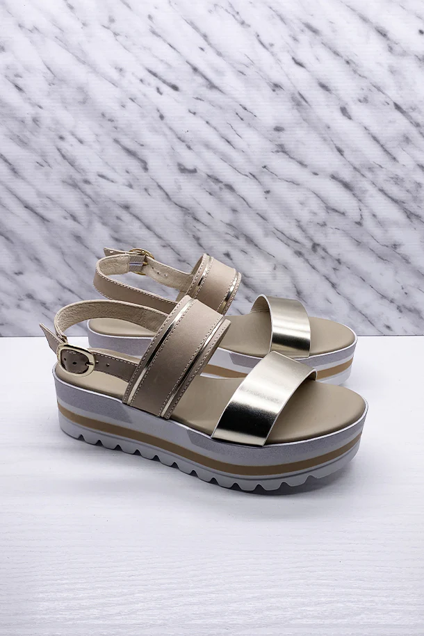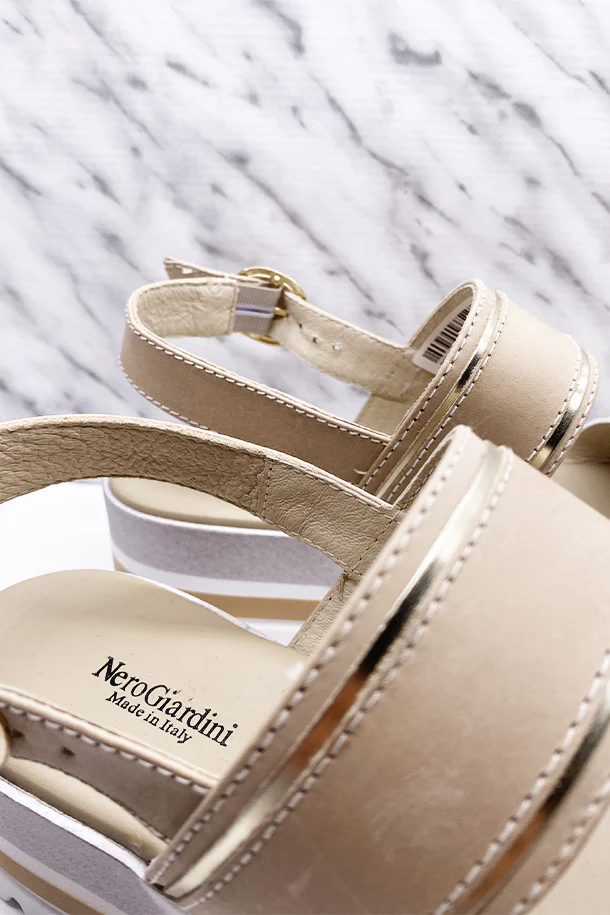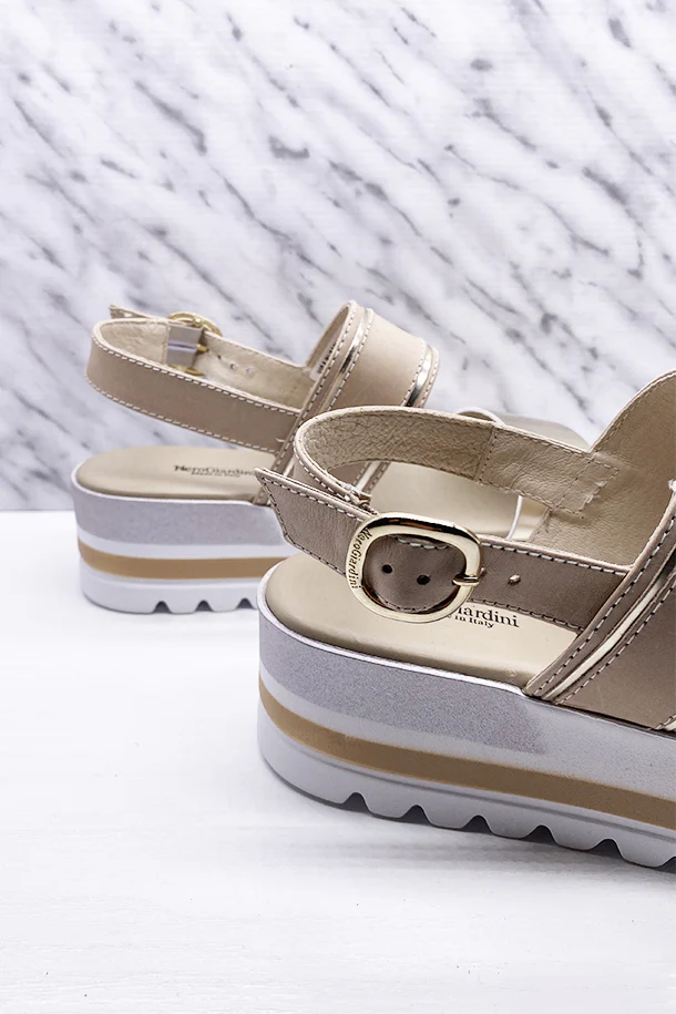Sandali in pelle con fibbia di regolazione alla caviglia e dettagli cangianti, suola in pelle con zeppa 60mm in gomma multicolore