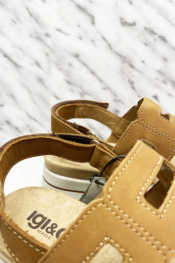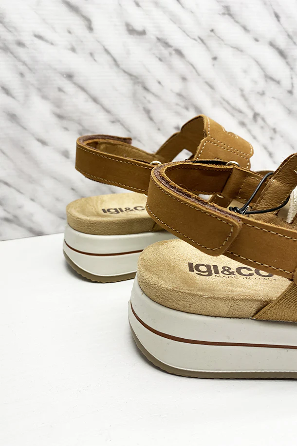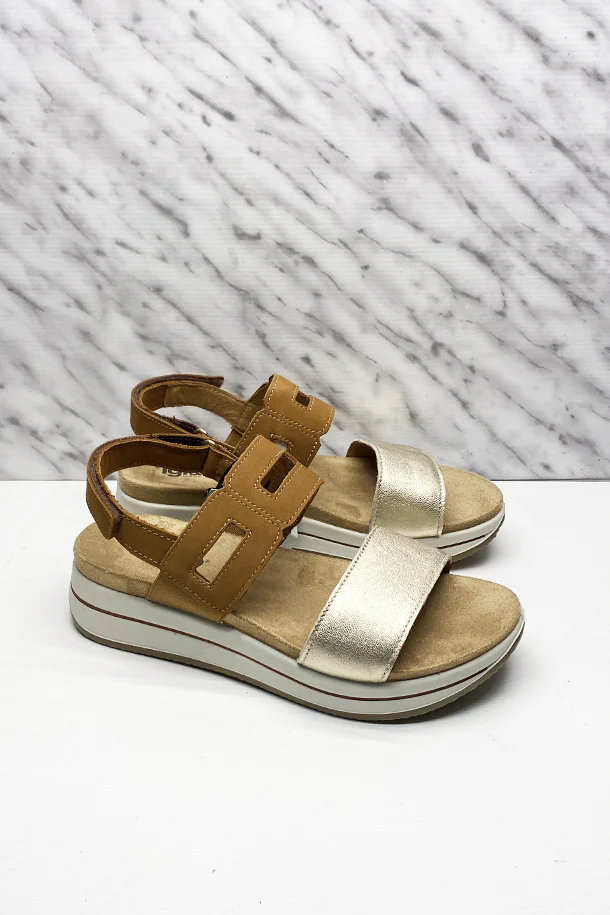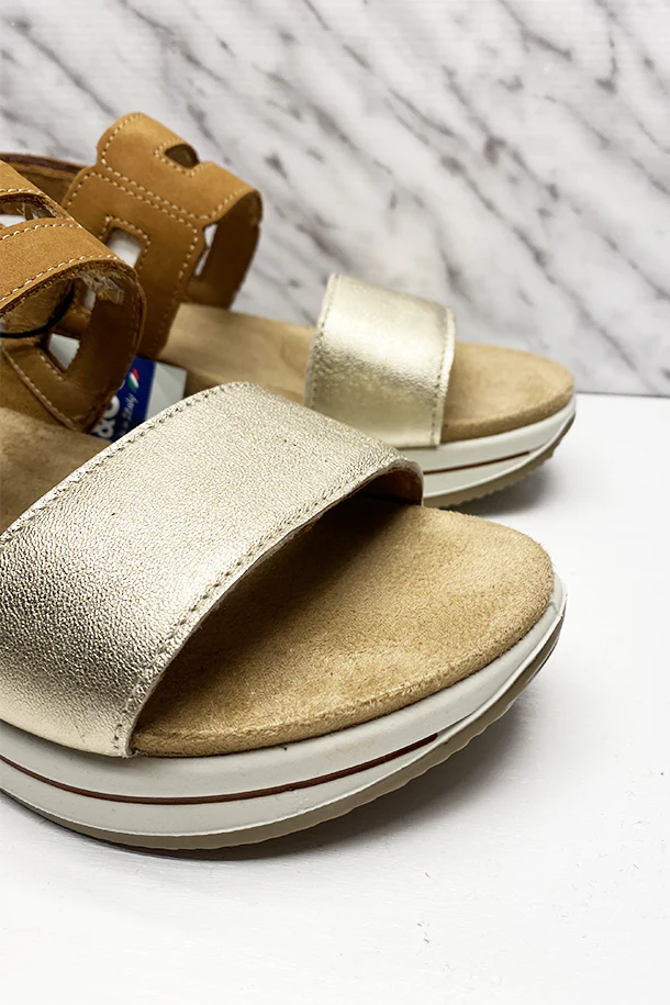 Sandali a doppia fascia in pelle con incisioni geometriche, frontale laminato, fascia posteriore con chiusura a strappo, suola scamosciata, platform 40mm in gomma bicolore