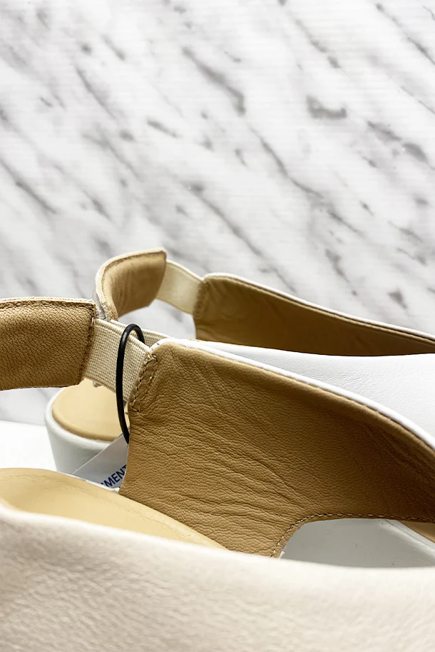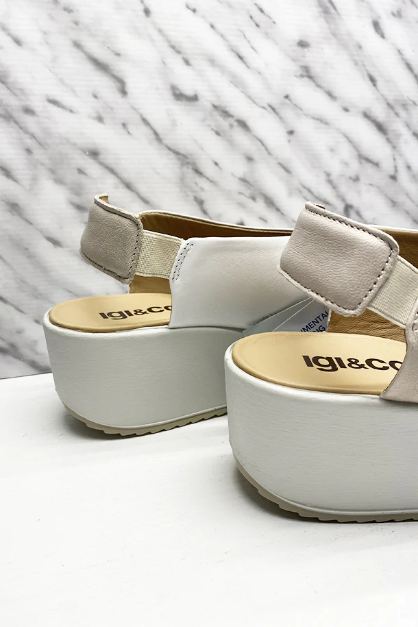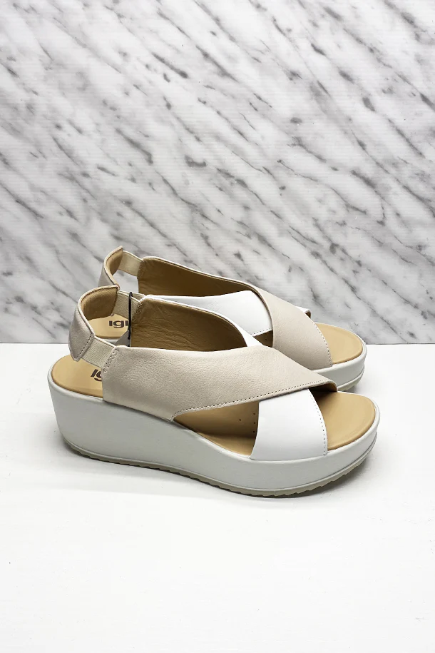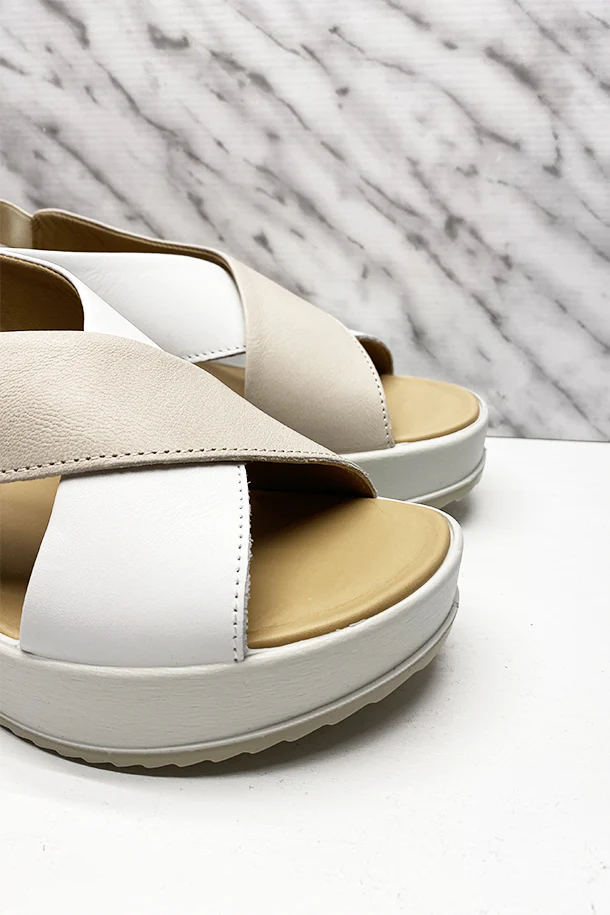 Sandali a doppia fascia intrecciata in pelle, fascia tallone con doppio inserto elastico, suola in pelle, zeppa 50mm in gomma