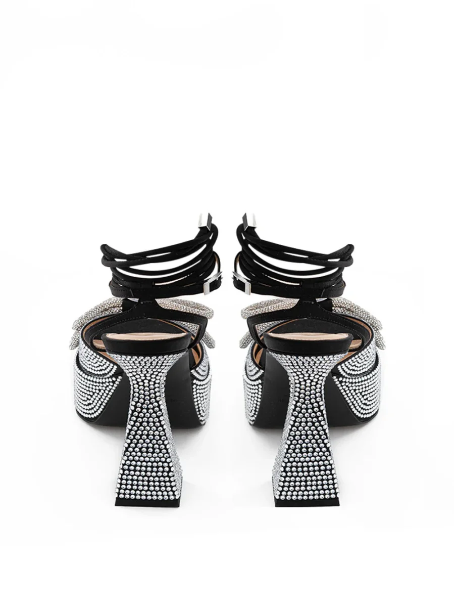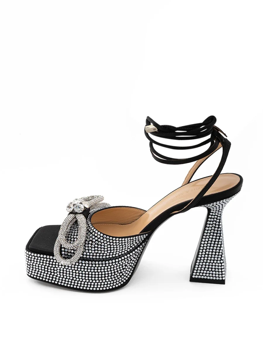 Sandali Plateau Nero con Cristalli Doppio Fiocco Mach & Mach. Punta quadrata, fascia in cristalli con doppio fiocco, ricoperta di cristalli sul plateau e sul tacco. Tacco a campana, allacciatura alla caviglia con cinturino e cordino. Altezza plateau: 3,5 cm-Sku interno:24MAR12