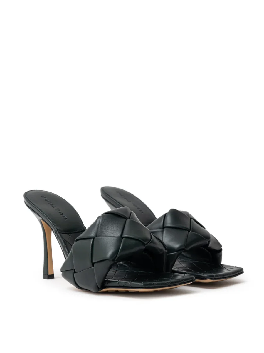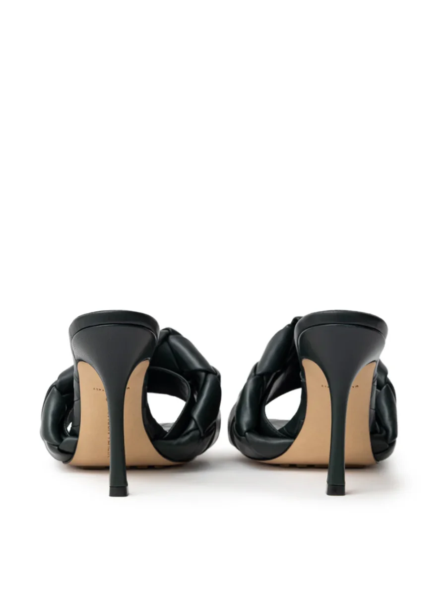 Sandalo Mule Lido in Verde Scuro Bottega Veneta. Punta quadrata, maxi intreccio tubolare, motivo intreccio sulla suola e logo stampato, tacco a stiletto. Composizione: 100% Pelle.