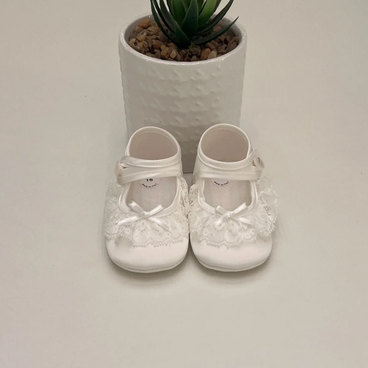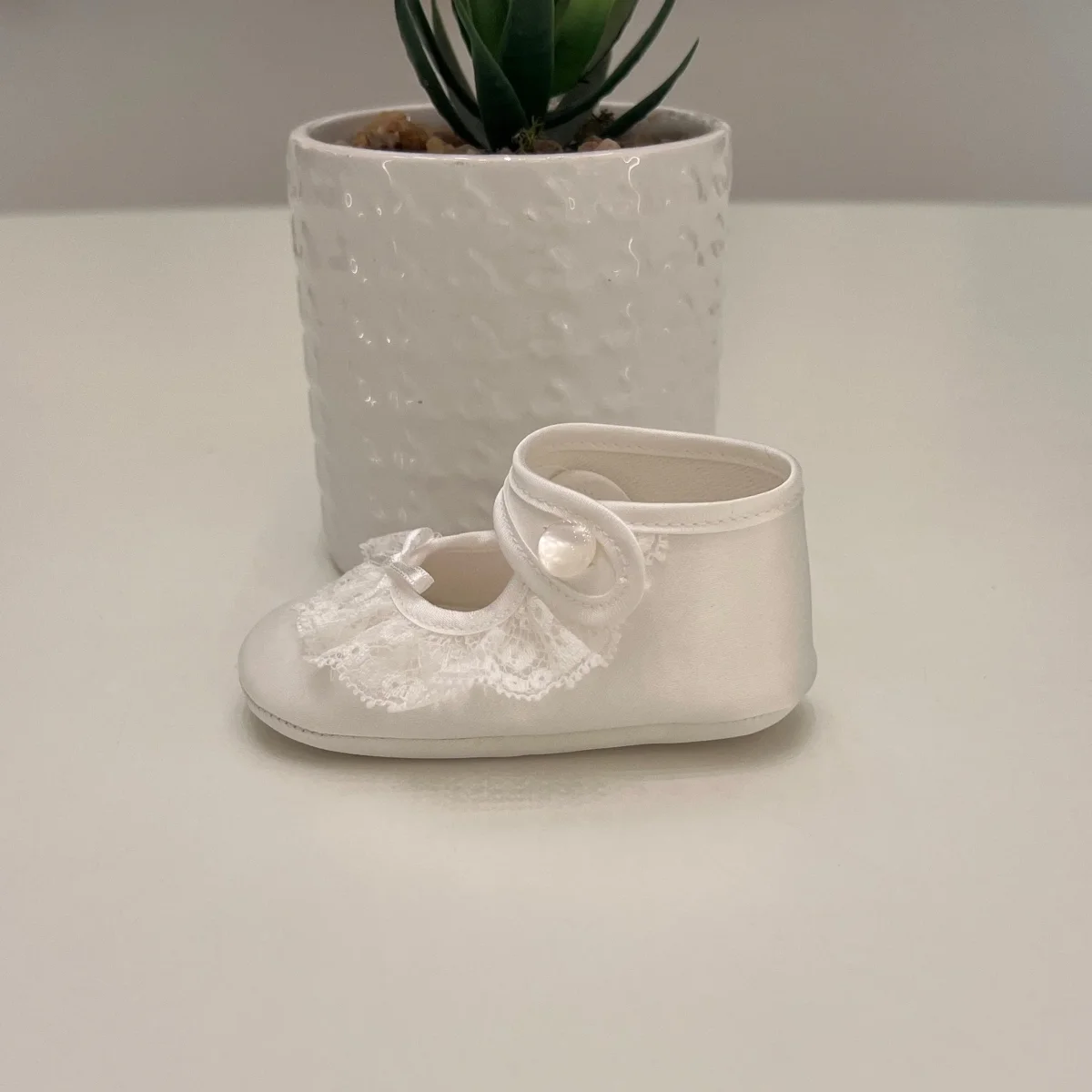 Scarpine da cerimonia in raso panna, rifinite con delicato pizzo e fiocchetto in raso. Chiusura con cinturino e fondo morbido, ideali per completare l’outfit con raffinatezza.
