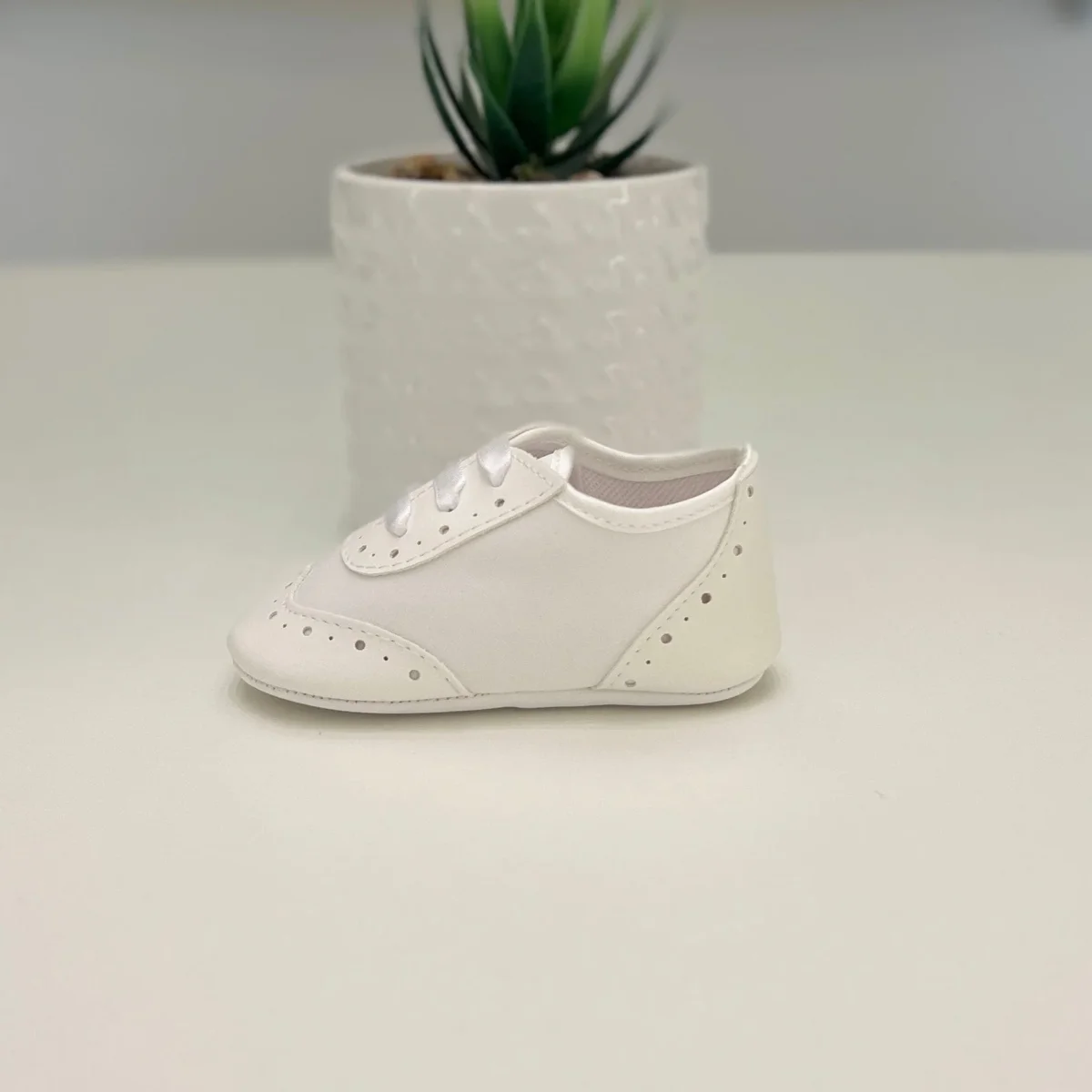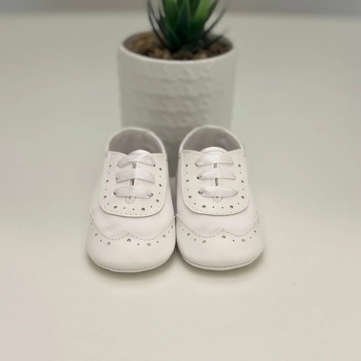 Scarpine da cerimonia neonato in raso e pelle bianca, con stringatura in raso e dettagli traforati. Fondo morbido e calzata confortevole, ideali per un look elegante e raffinato.