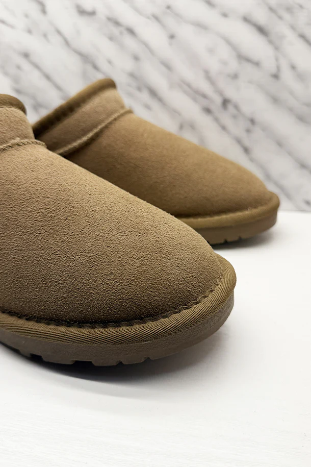 Scarponcini slip on in pelle scamosciata solid color con impunture a vista, interno in eco pelo, suola in gomma