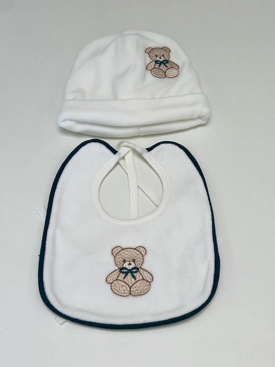 Cappello e bavetta per neonato, realizzati in morbida ciniglia, con orsetti ricamati e bordature in verde petrolio, aggiungendo un tocco di dolcezza e stile.
