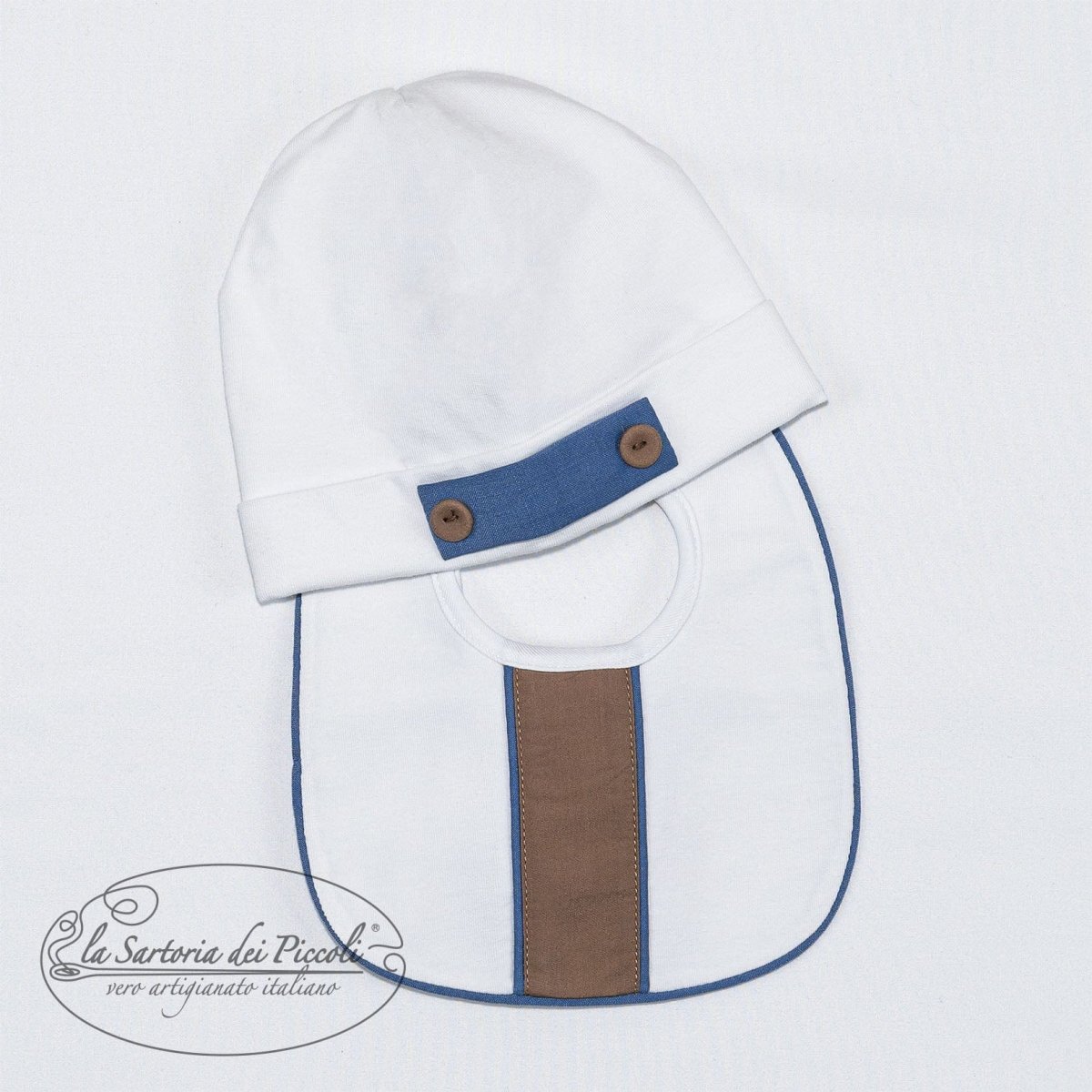 Coordinato cappello e bavetta in puro cotone, bianco con delicati dettagli beige e blu. Un set pratico ed elegante, ideale per completare con stile il look del tuo neonato.