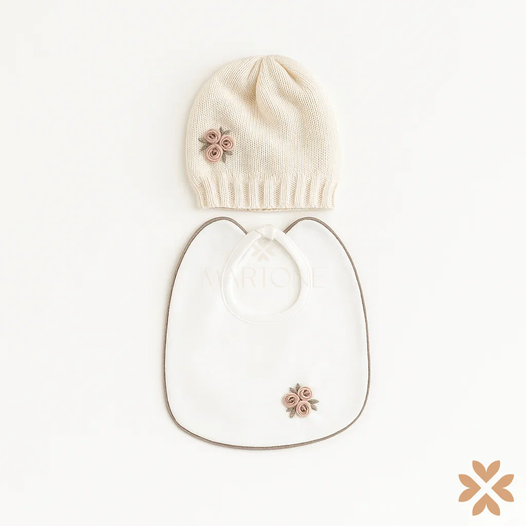 Set coordinato composto da cappellino in maglia e bavetta ricamata con roselline.
