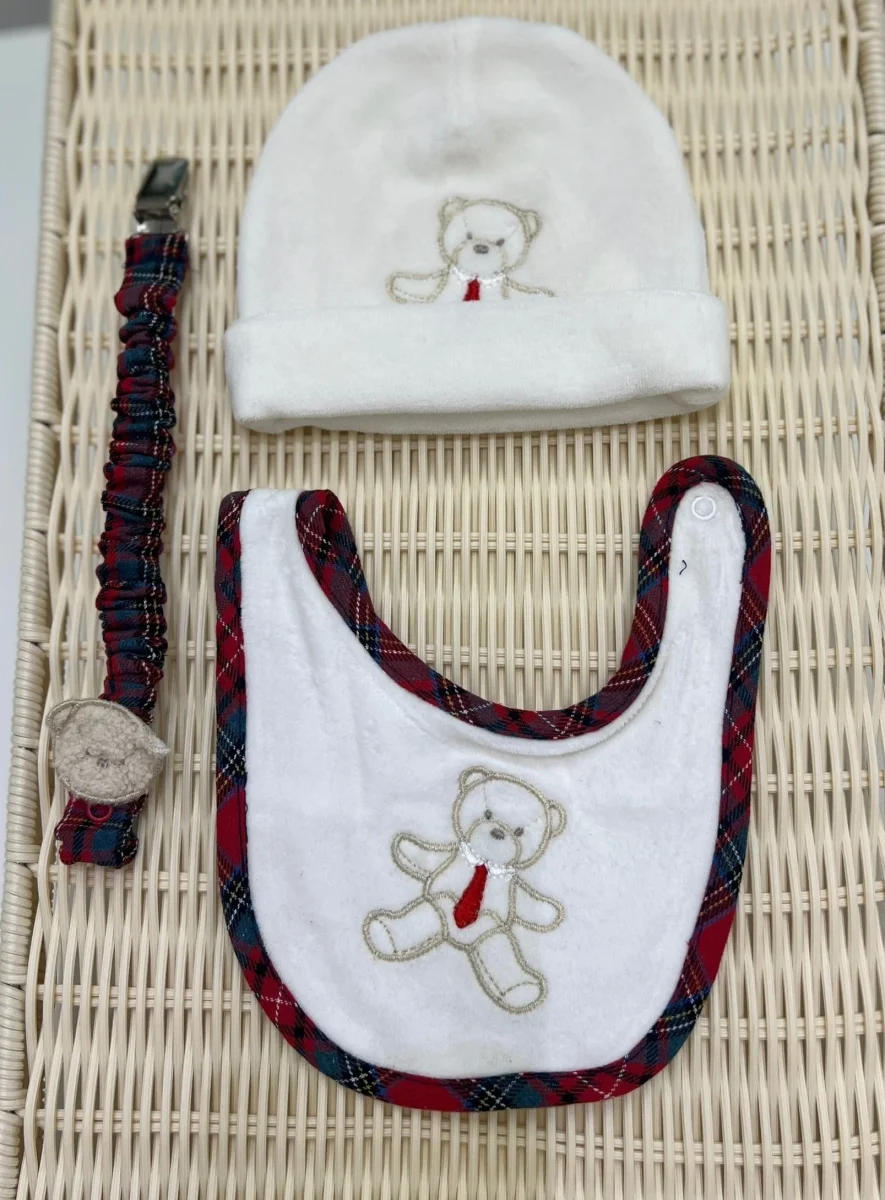 Questo tenero set di accessori comprende cappellino, bavetta e portaciuccio realizzati in ciniglia, abbinati nei minimi dettagli per offrire al tuo piccolo sia comfort che stile.