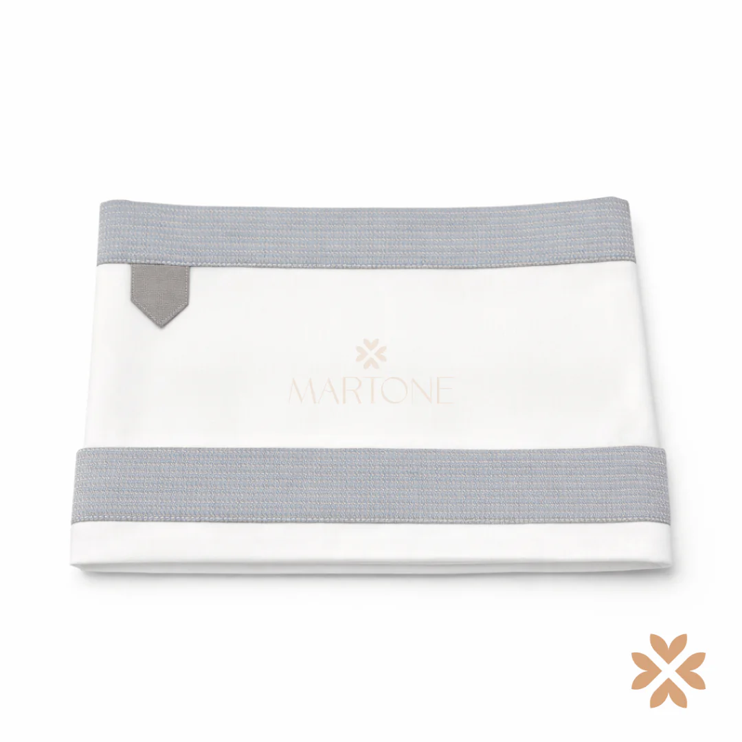 Composto da lenzuolo sopra con doppia fascia in tessuto celeste polvere pied de poule e applicazione decorativa a contrasto, lenzuolo sotto coordinato e federa abbinata.