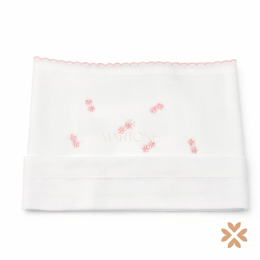 Set lenzuola neonata in cotone con ricamo fiorellini rosa.
