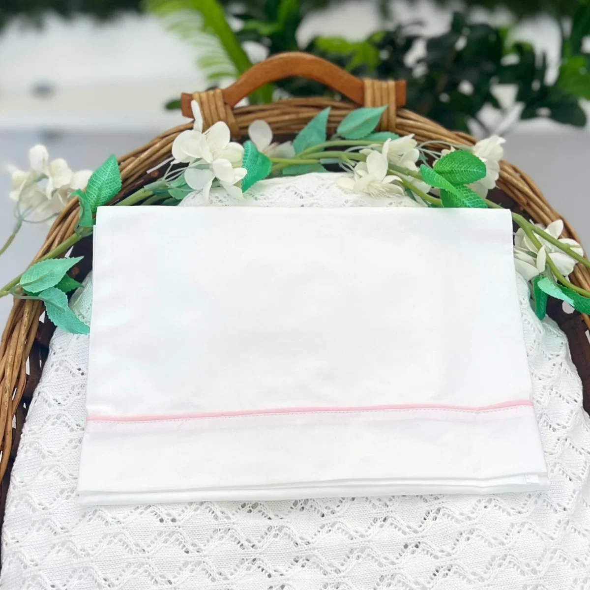 Set lenzuola neonata in cotone, composto da lenzuolo sopra, lenzuolo sotto con angoli e federa, tutti impreziositi da un elegante bordino. Un set morbido e delicato, perfetto per la culla della tua piccola.