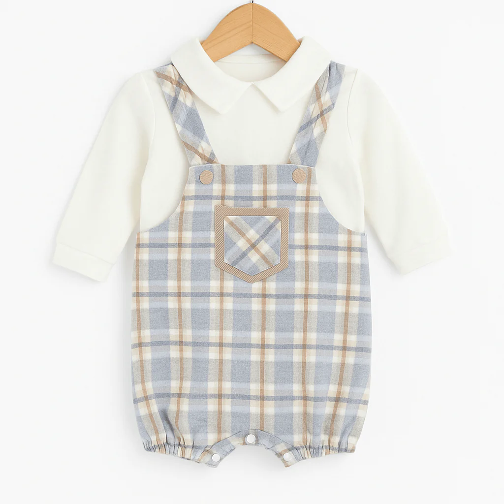 Tutina due pezzi per neonato, composta da body a maniche lunghe color panna con colletto tondo e salopette corta in morbido tessuto scozzese azzurro, beige e panna.