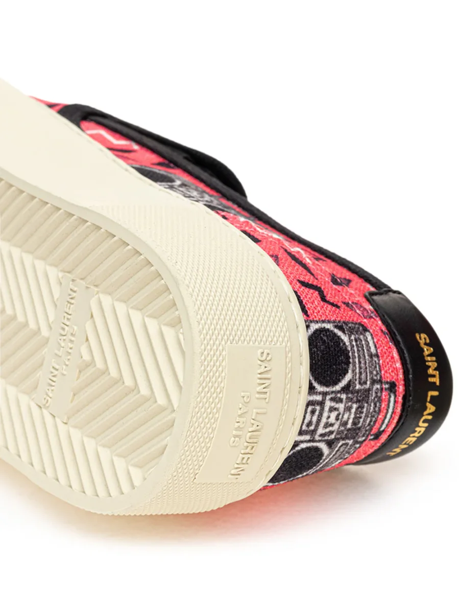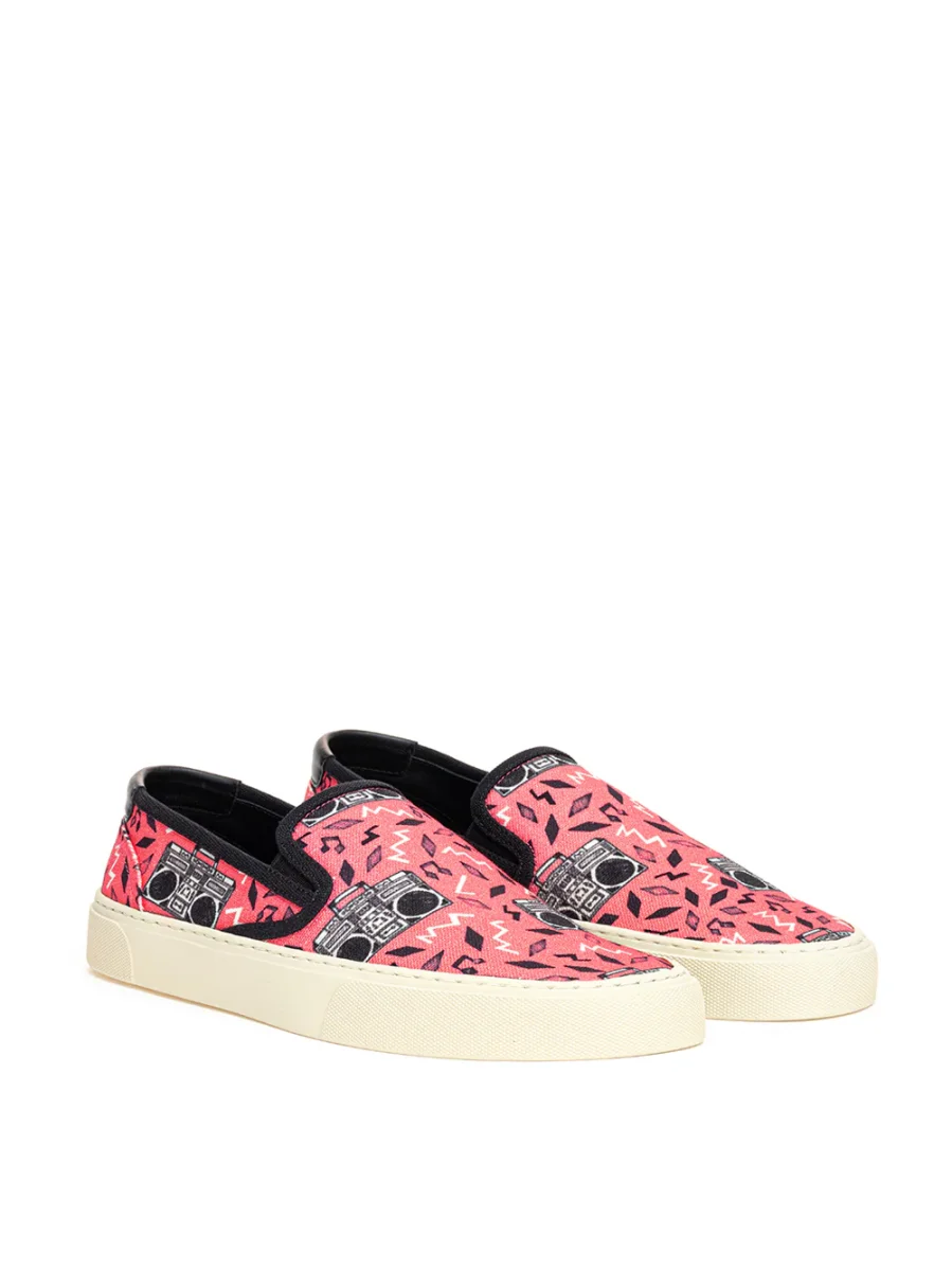 Slip on in Canvas Rosa con Stampa Radio Saint Laurent. Slip on Venice in tela di cotone rosa, con stampa allover, suola in gomma bianca, punta tonda, linguetta posteriore in pelle nera con logo. Logo stampato sulla parte posteriore della suola. Altezza suola: 3 cm. Composizione: 100% Cotone, interno in Pelle.-Sku interno:24MG87