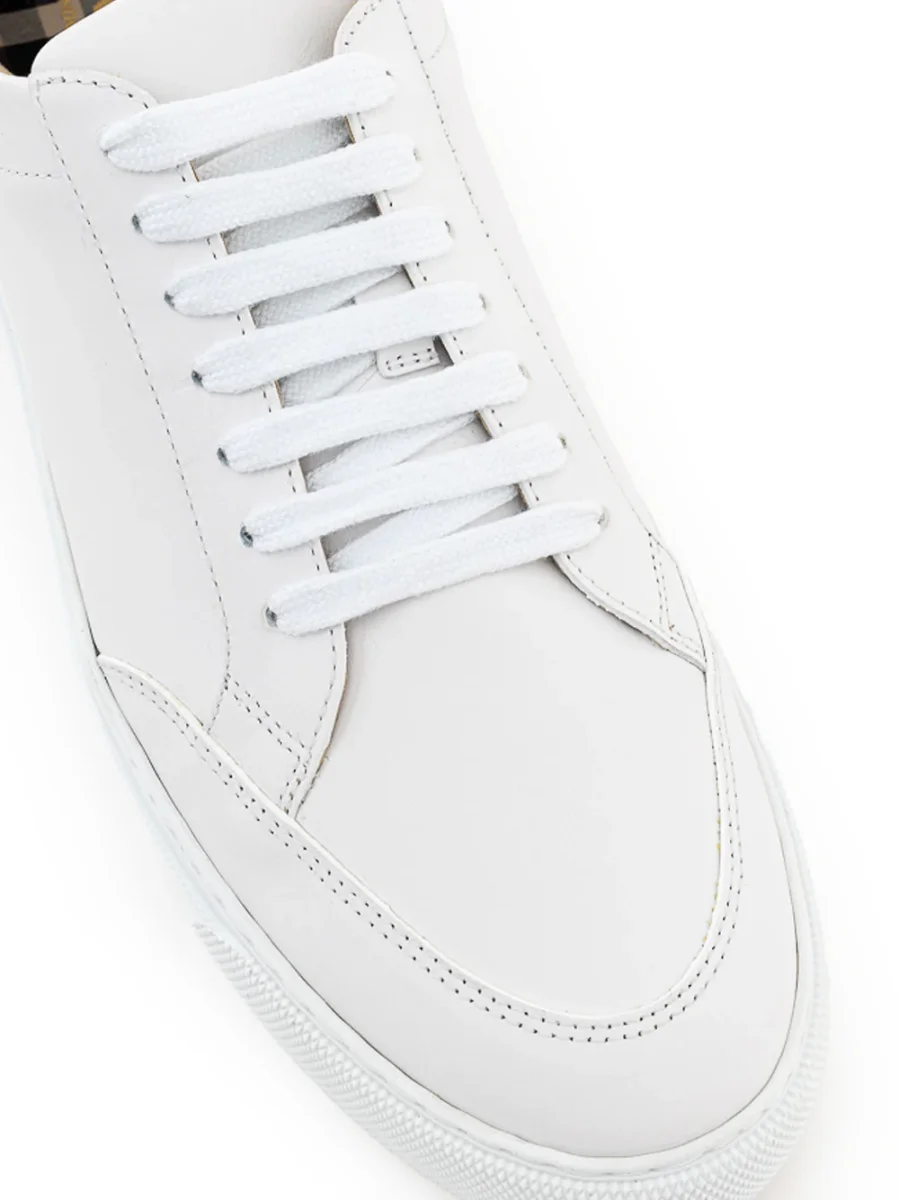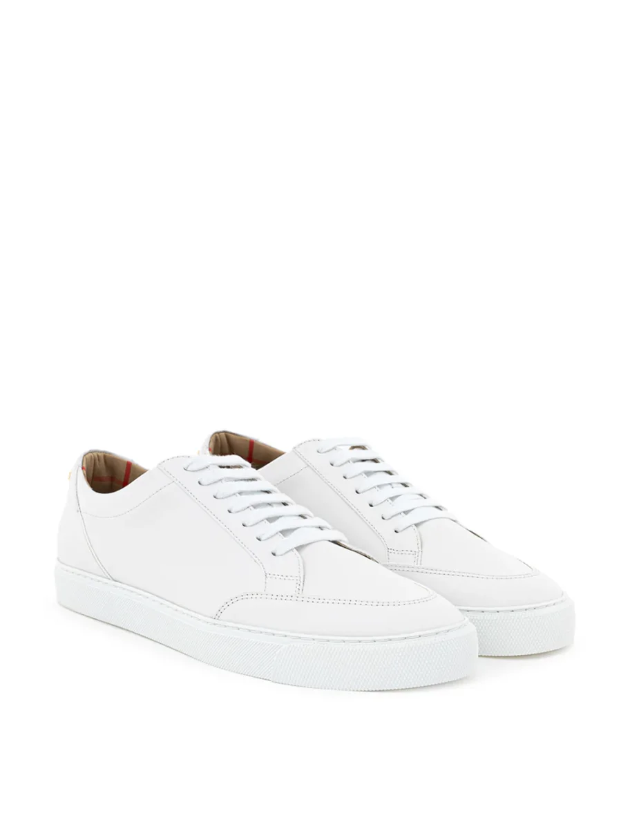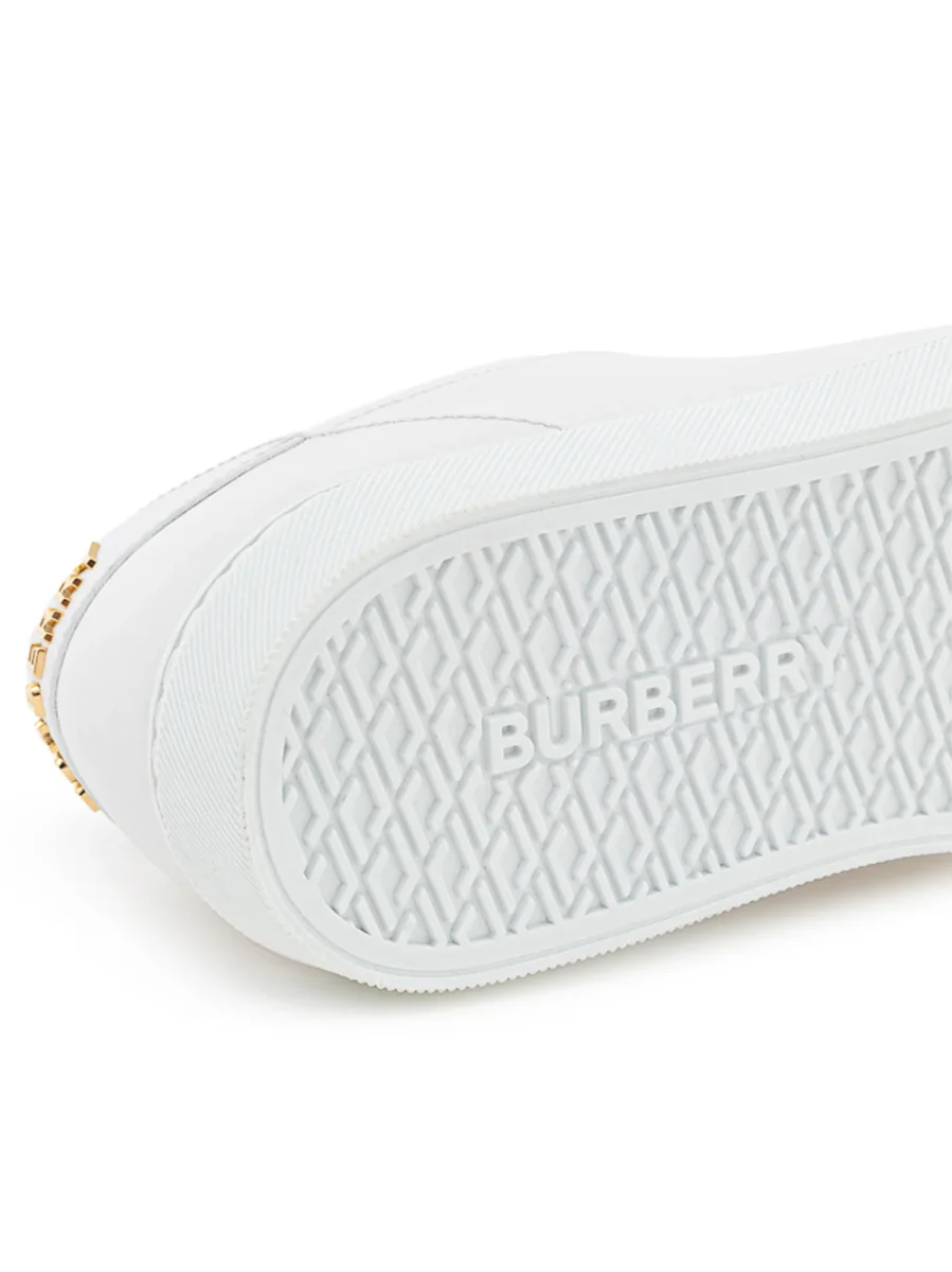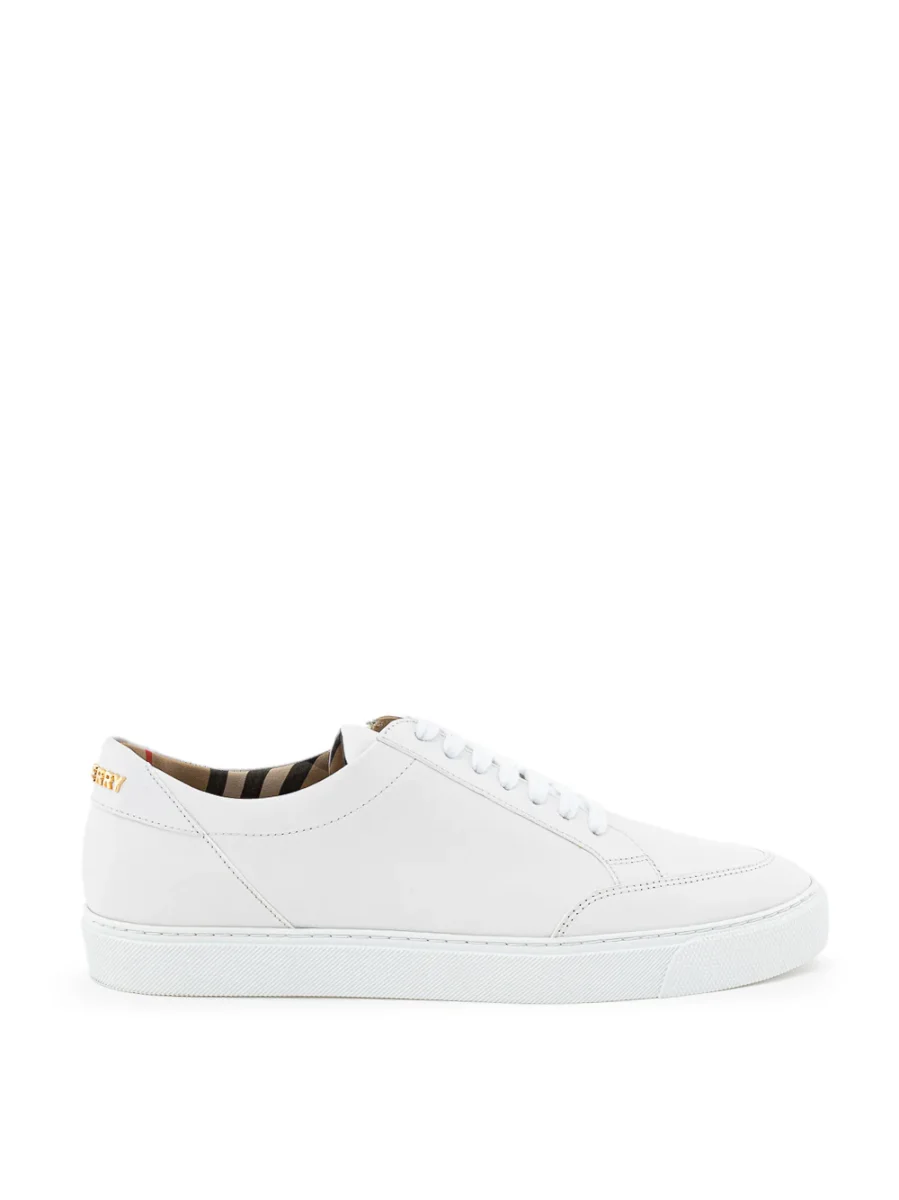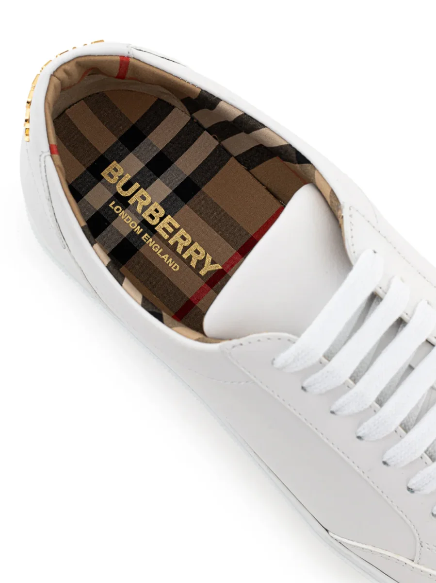 Sneaker in Pelle Bianca Burberry. Allacciatura frontale con lacci bianchi, punta tonda, impunture tono su tono, interno foderato con Burberry check. Logo metal dorato applicato sul retro. Composizione: 100% Pelle-Sku interno:24GIU90