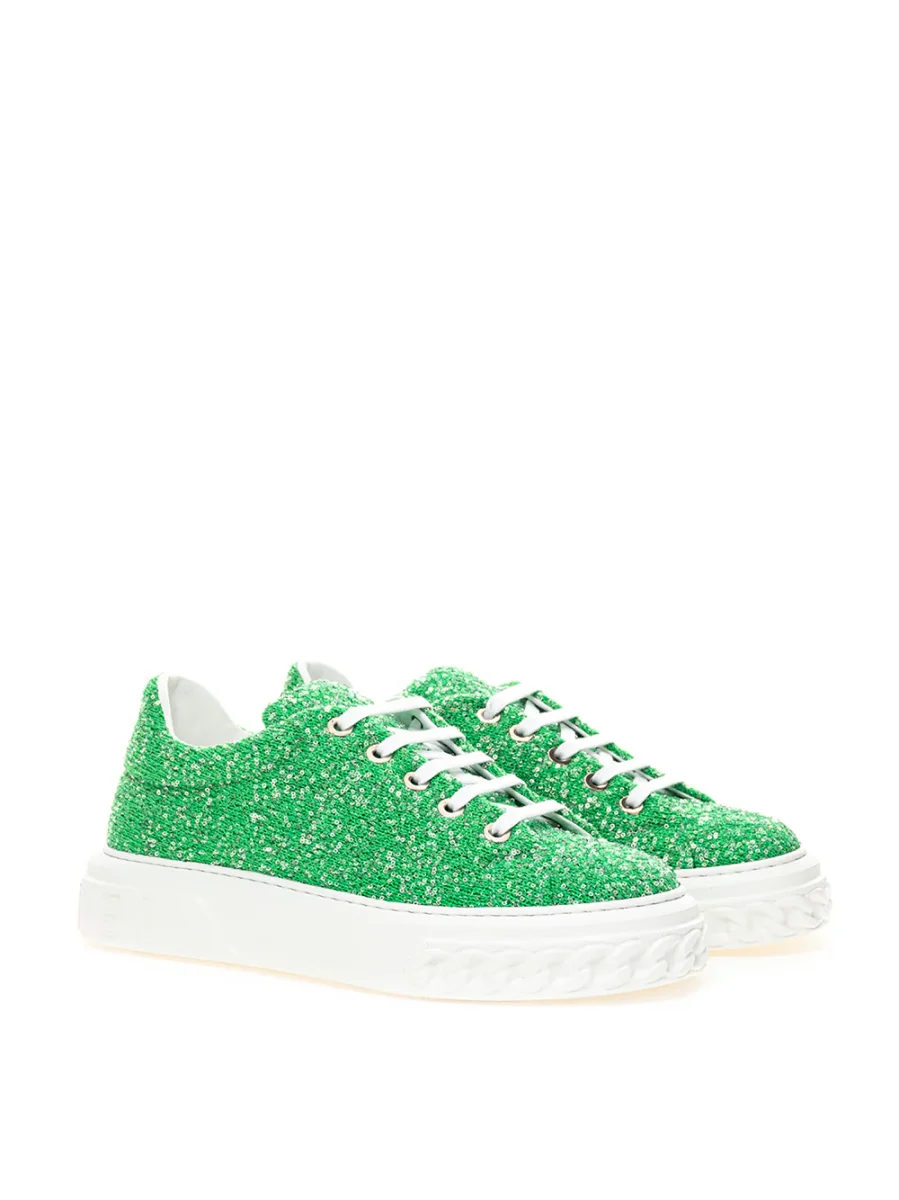 Sneaker Verdi Casadei Off Road Disk. Allacciatura con lacci bianchi, suola in gomma bianco con catena a bassorilievo e logo stampato sul retro. Tomaia in tessuto verde topazio di maglia con paillettes applicate all over. Altezza suola: 4 cm-Sku interno:24AP176