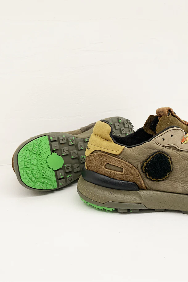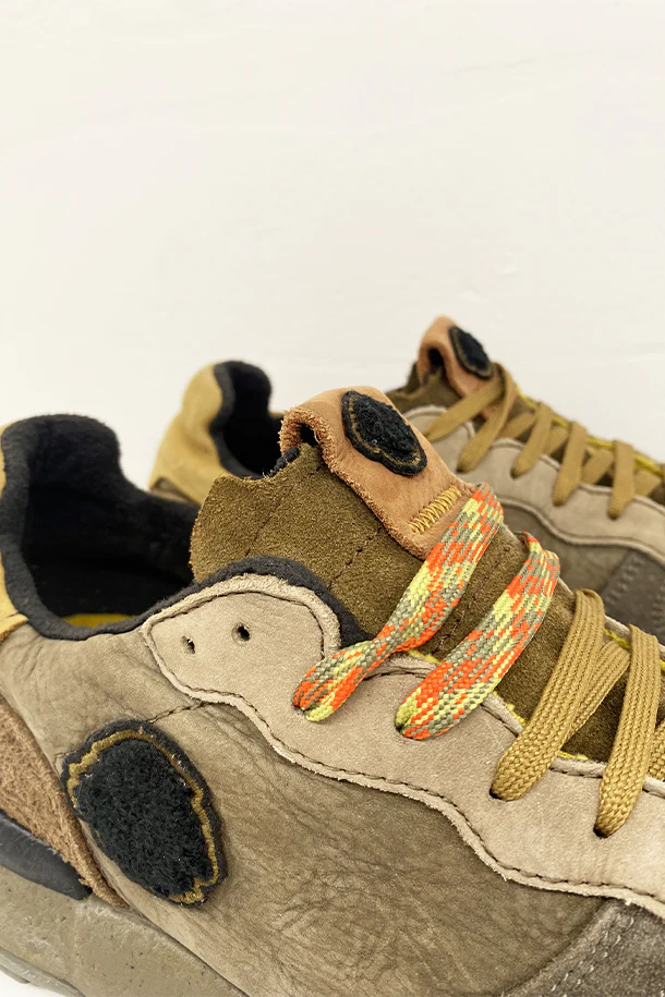 Sneakers allacciate in pelle nabuck naturale con inserti in tinta, doppi lacci tinta unita e fantasia, maxi logo laterale, suola incisa in gomma multi materiale