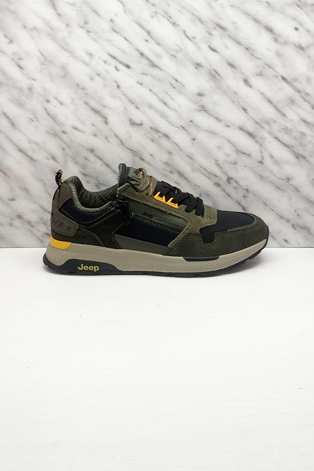 Sneakers allacciate in pelle e tessuto tecnico con inserti scamosciati, zip laterale con fascia logata impermeabile, doppi lacci, inserti gommati in tinta, suola logata in gomma multicolore