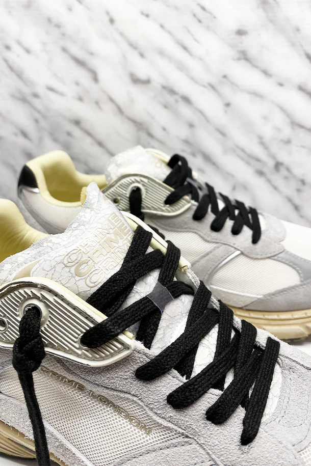 Sneakers allacciate in nylon con inserti scamosciati a contrasto, dettagli gommati e laminati, interno interamente in pelle, lacci in cotone, suola oversize in gomma finitura vintage