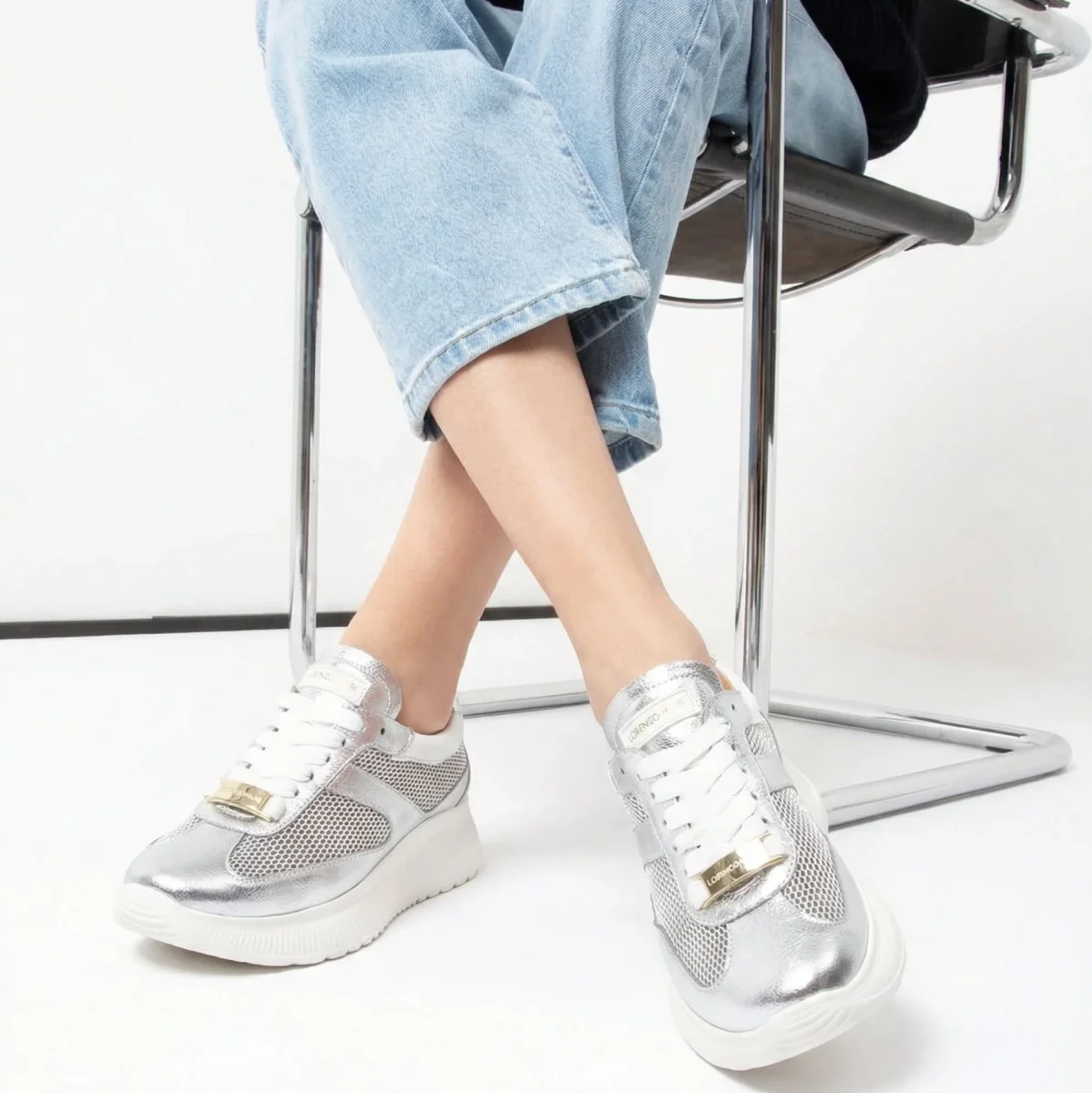 La tomaia in pelle laminata argento si combina con inserti in rete mesh traspirante e dettagli in nappa bianca per un equilibrio perfetto tra sportivo e sofisticato.