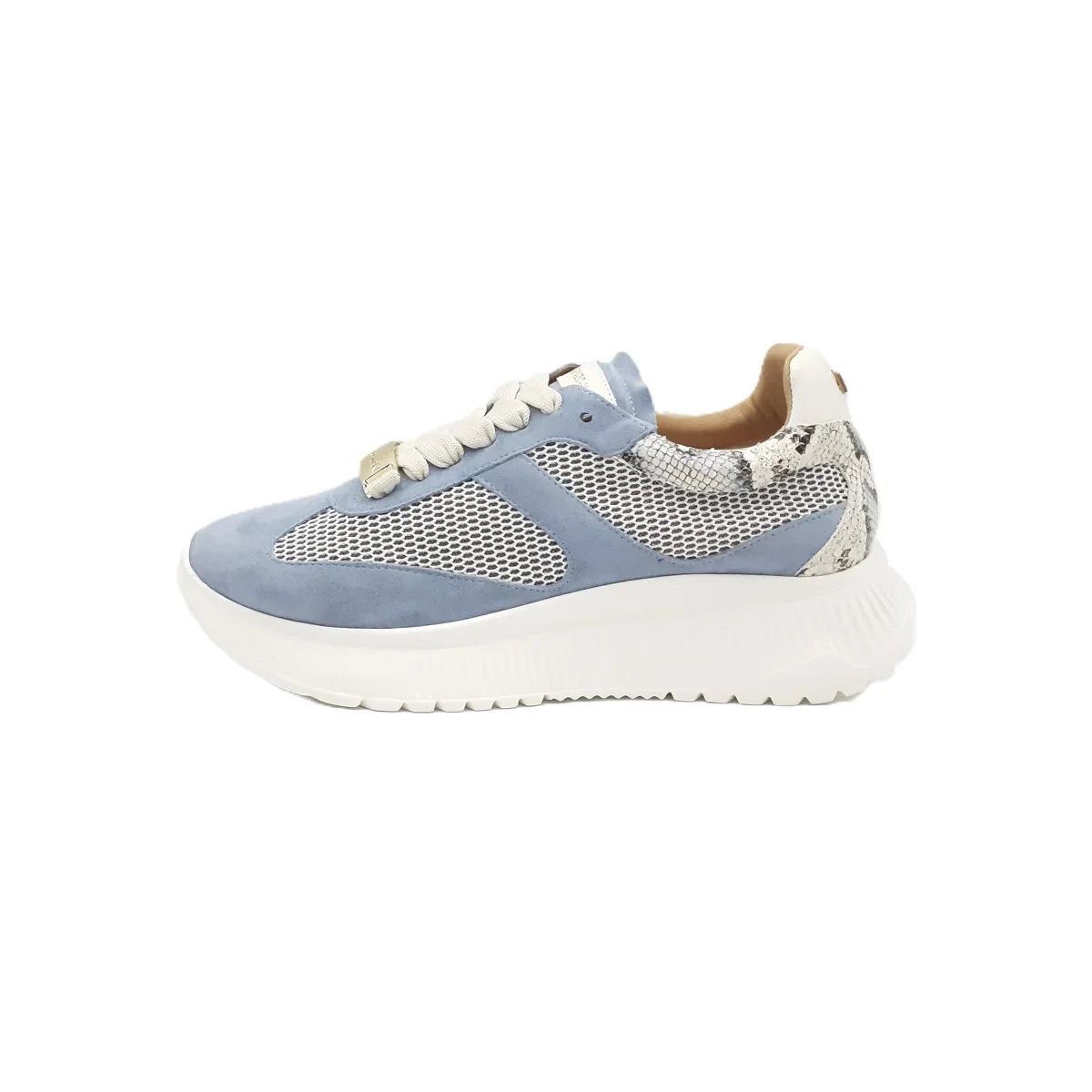 La tomaia in camoscio cielo si combina con inserti in rete mesh traspirante e dettagli in pitone cielo per un equilibrio perfetto tra sportivo e sofisticato.