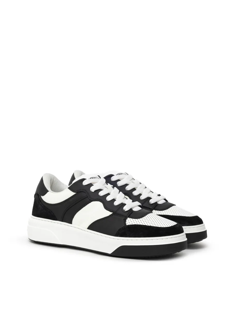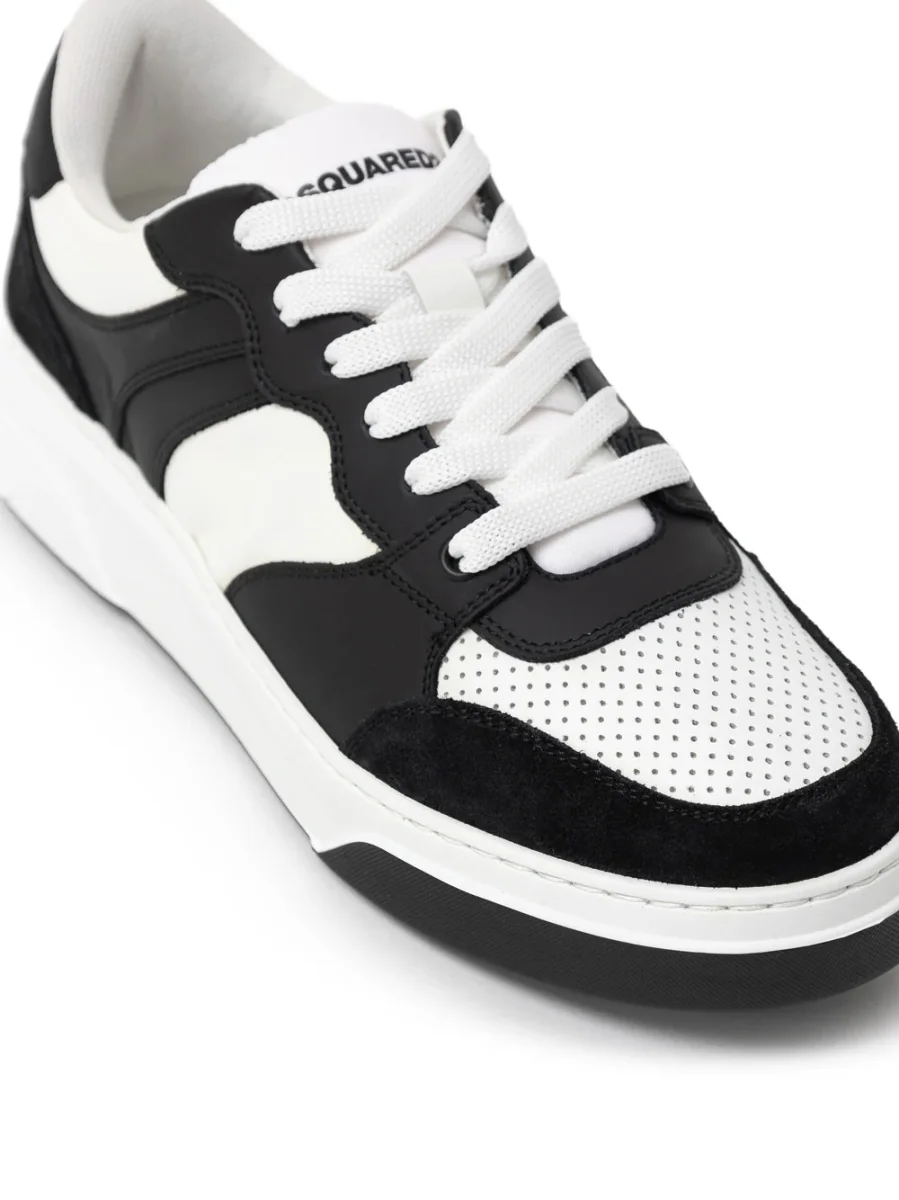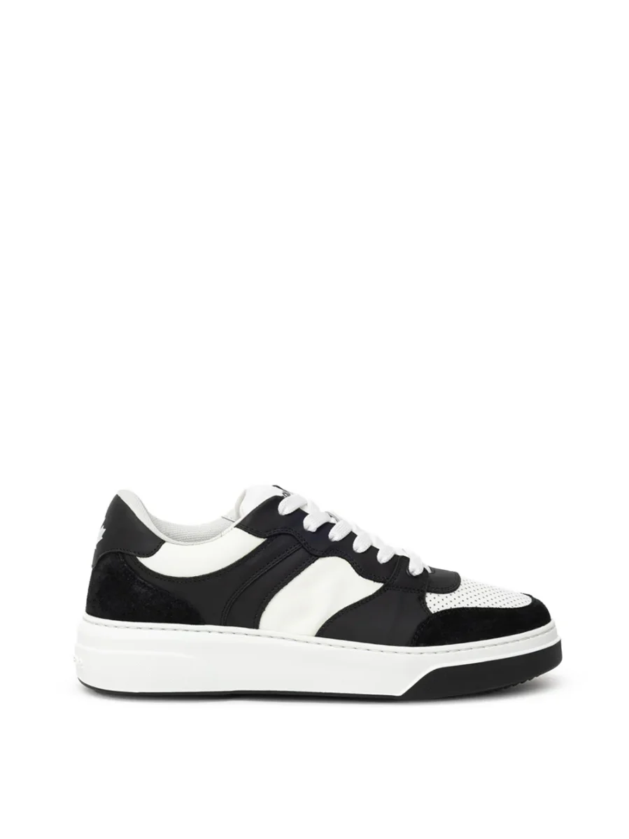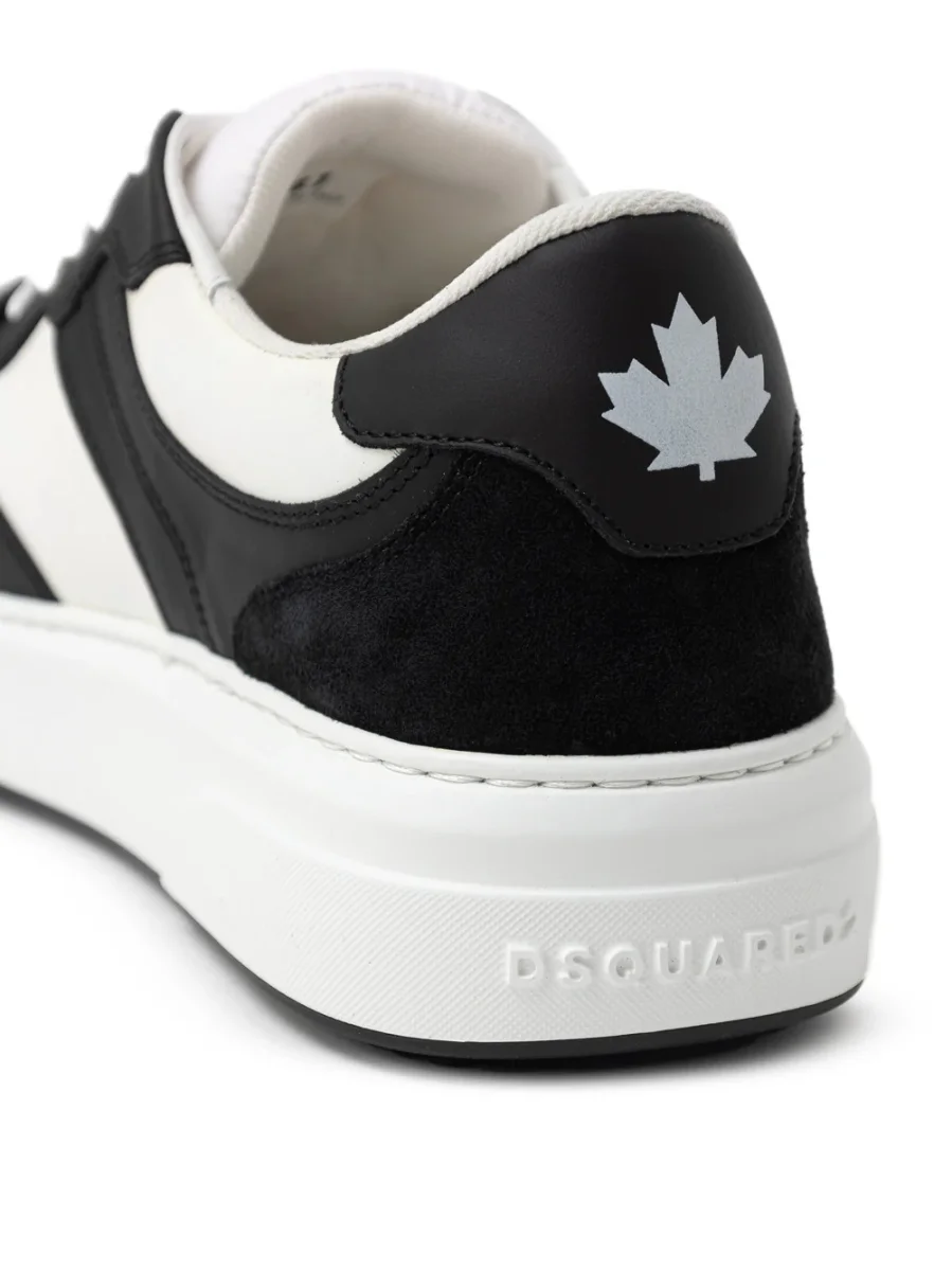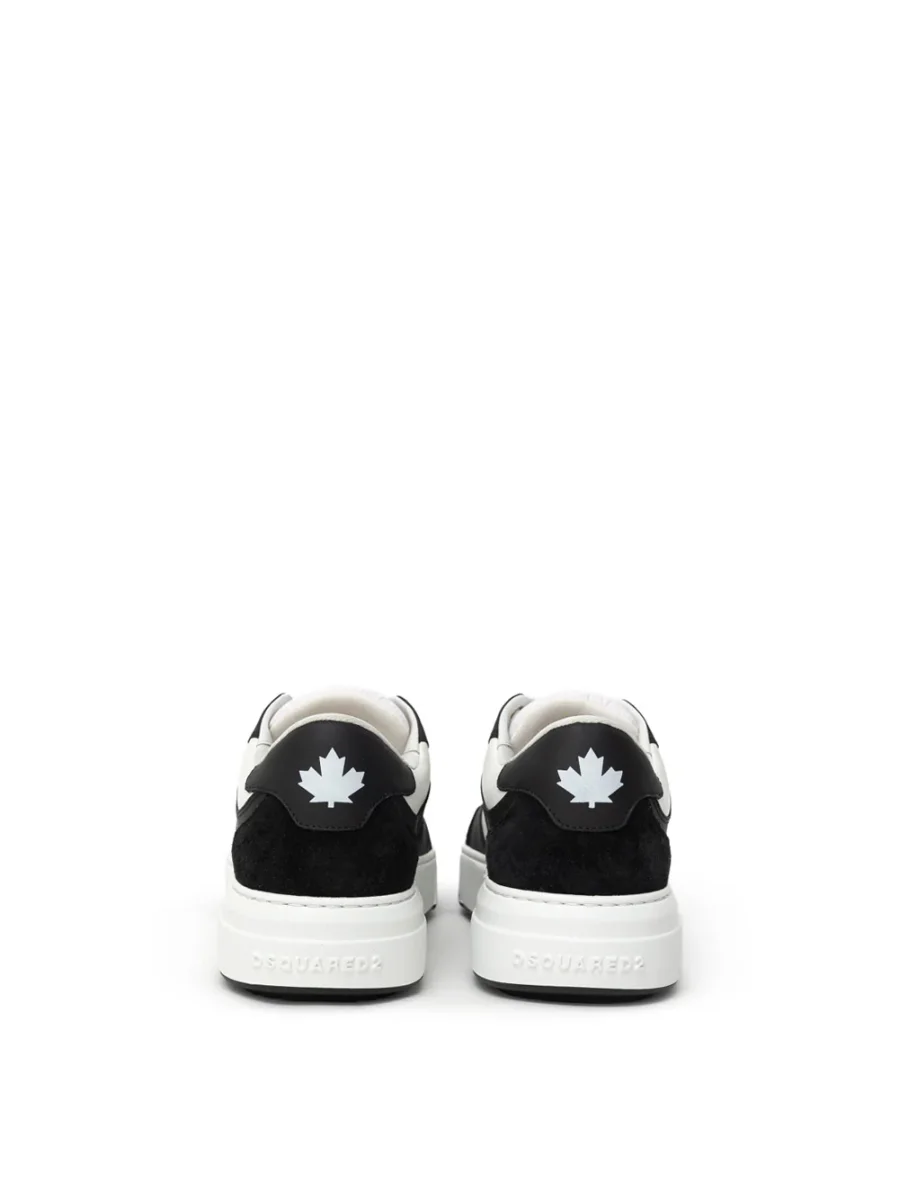 Sneakers Bumper in Pelle Dsquared2. Allacciatura frontale con lacci bianchi, in pelle bianca e nera con inserti in camoscio nero sulla parte frontale e posteriore. Logo acero stampato sul retro a contrasto, suola alta in gomma bianca e logo Dsquared2 tono su tono.