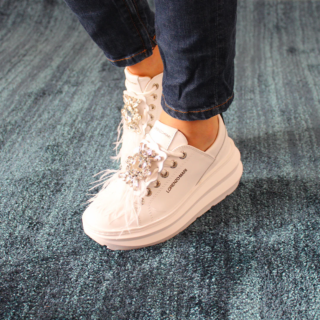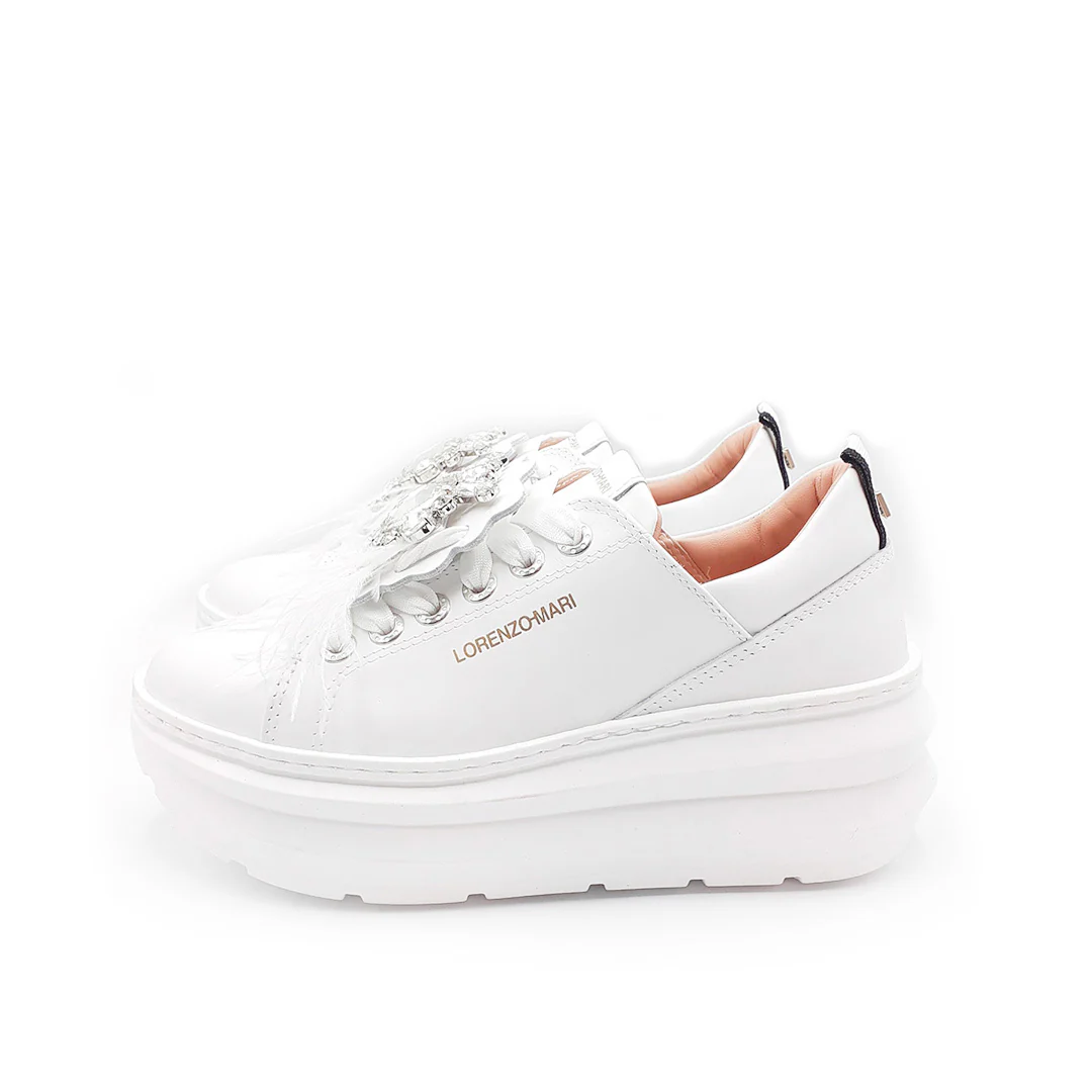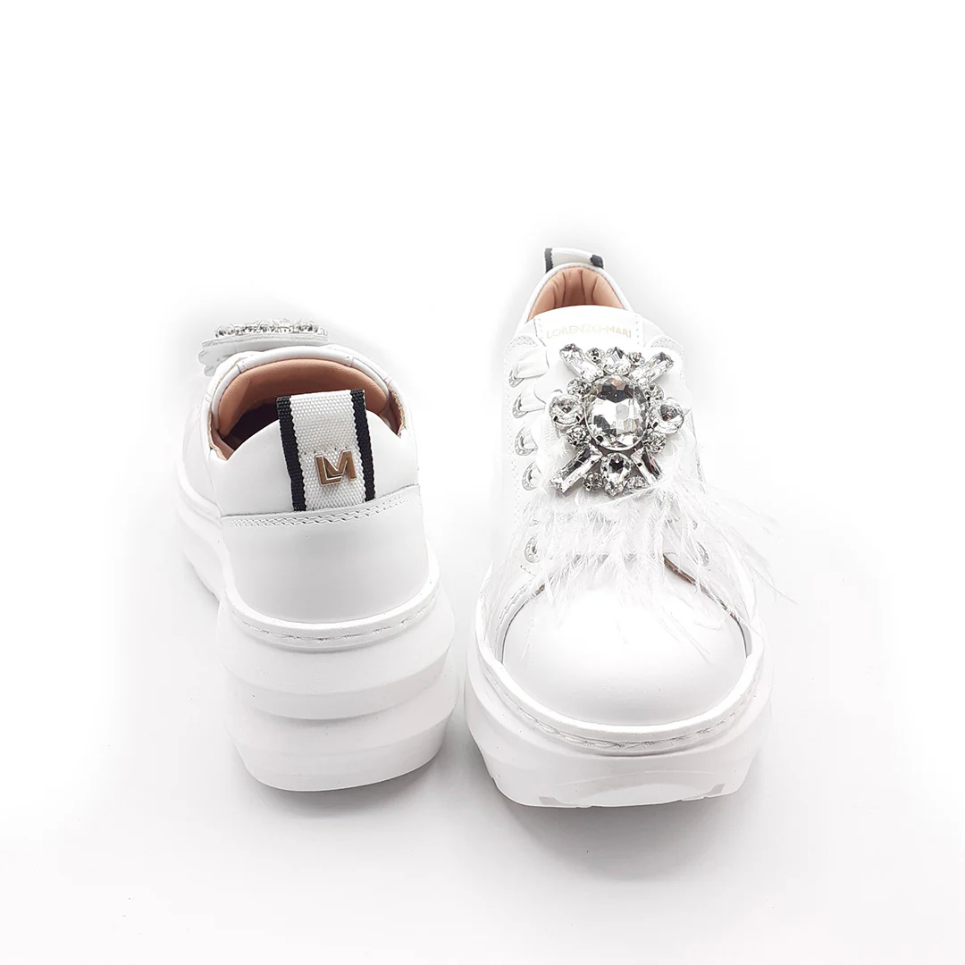 La sneaker Veronica presenta un design monocromatico ed è realizzata con un accessorio in strass e piume oversize che può essere rimosso lasciando la sneakers con un design semplice. Il nuovo logo LM sul tallone la rende facile da calzare inoltre la sua costruzione leggera e confortevole la rende un vero must-have! La scarpa è alta e caratterizzata da un platform unico ed originale alto 6cm che slancia e ammortizza ad ogni passo.