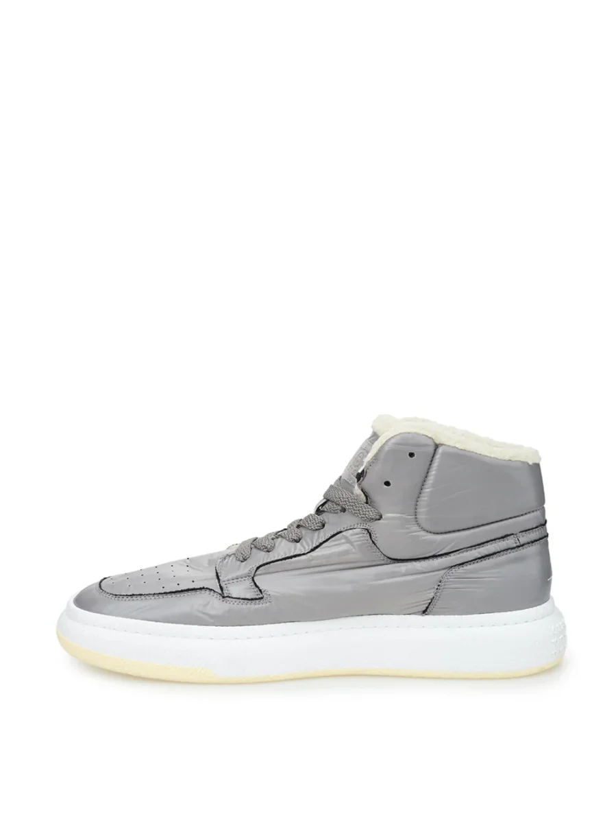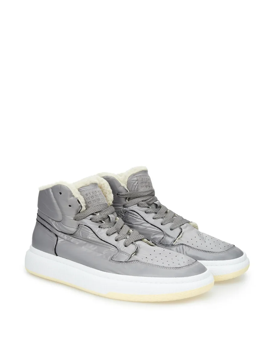 Sneakers Alta con Pelo Interno MM6 Maison Margiela in tessuto tecnico grigio, allacciatura frontale con lacci tono su tono, punta leggermente squadrata con piccoli fori, suola a contrasto bianca con lavorazione martellata. Sulla parte posteriore della suola numeri incisi, cucitura iconica a contrasto sulla parte posteriore della scarpa, pelo all’interno di tutta la scarpa. Altezza suola: 4 cm-Sku interno:23NOV56