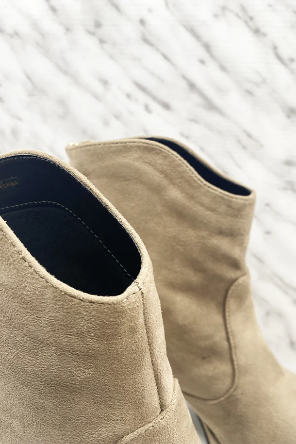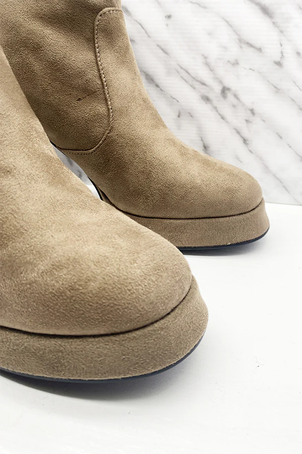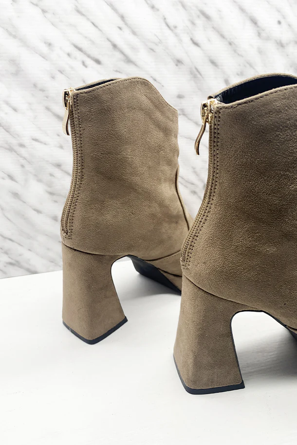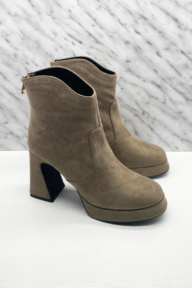 Stivaletti in eco pelle scamosciata solid color, zip posteriore. tacco 80mm sagomato rivestito in tinta con plateau 20mm, fondo e suola in gomma