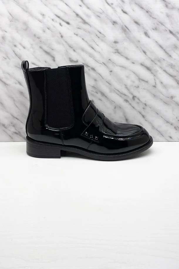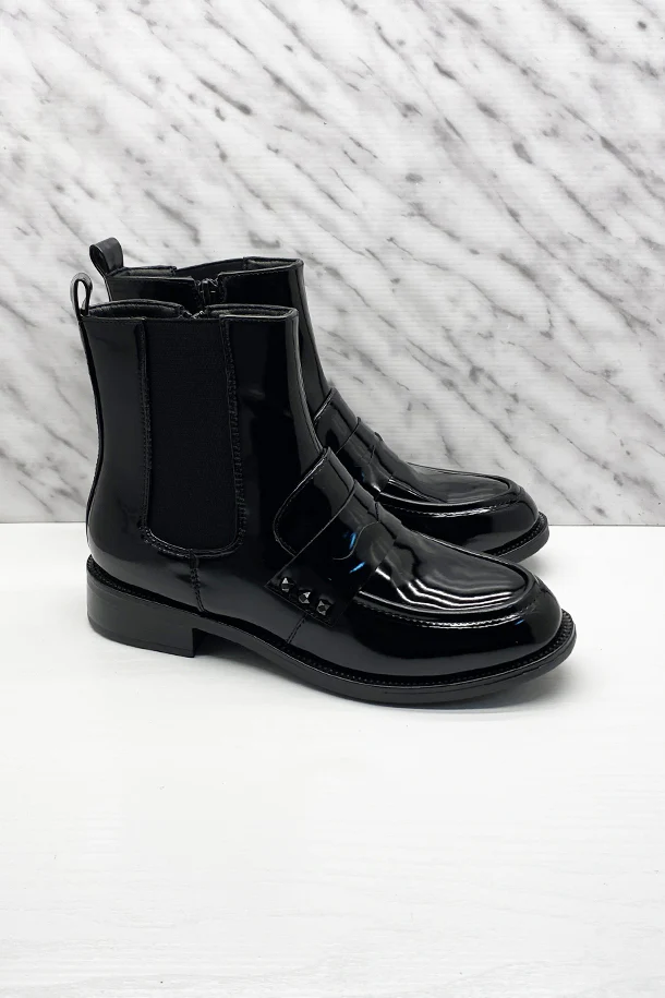 Stivaletti in eco pelle verniciata solid color con design finto mocassino, inserto elastico laterale e zip laterale interna, borchie metalliche, fondo classico in gomma