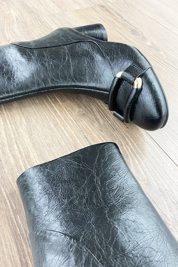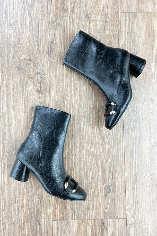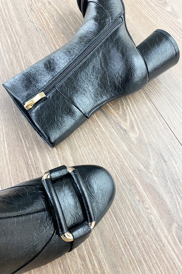 Stivaletti a punta rotonda in eco pelle solid color con zip laterale interna, fibbia metallica rivestita decorativa frontale, suola interna in pelle, tacco 50mm in tinta con fondo in gomma