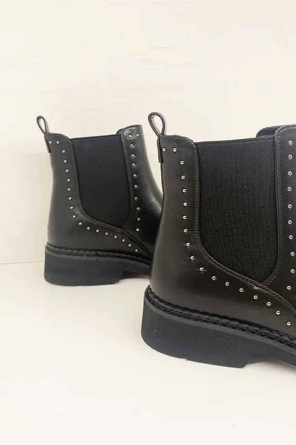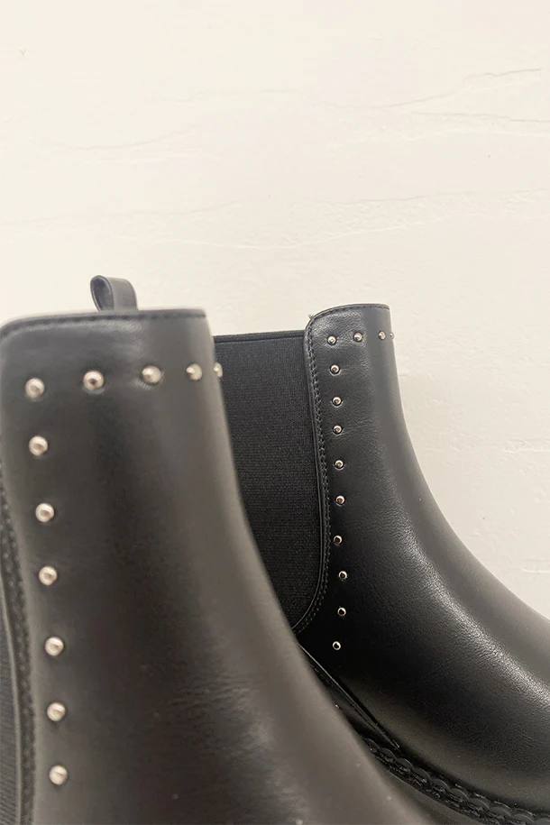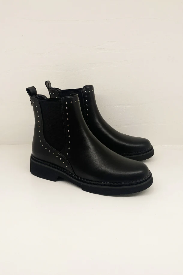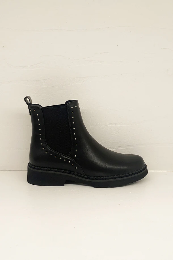 Stivaletti in eco pelle solid color con inserti elasticizzati laterali in tinta, borchie metalliche decorative, fondo classico in gomma